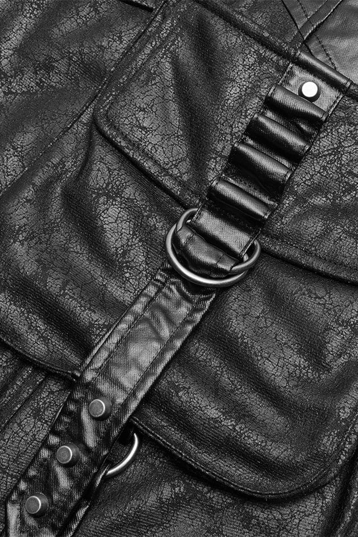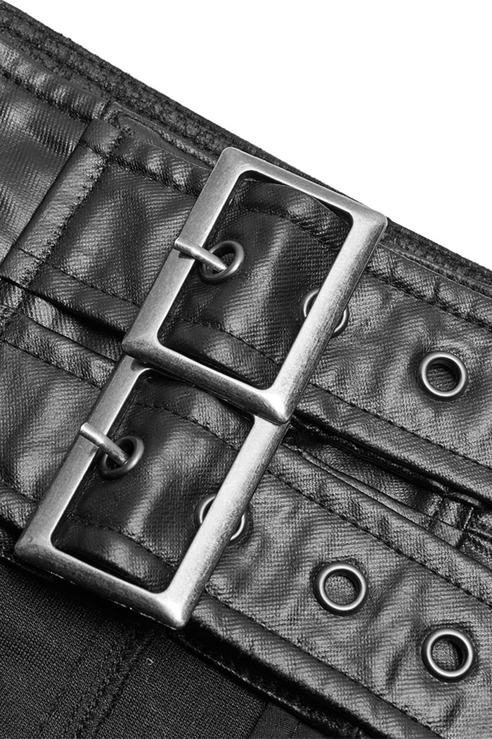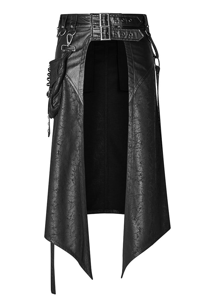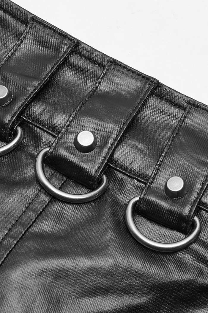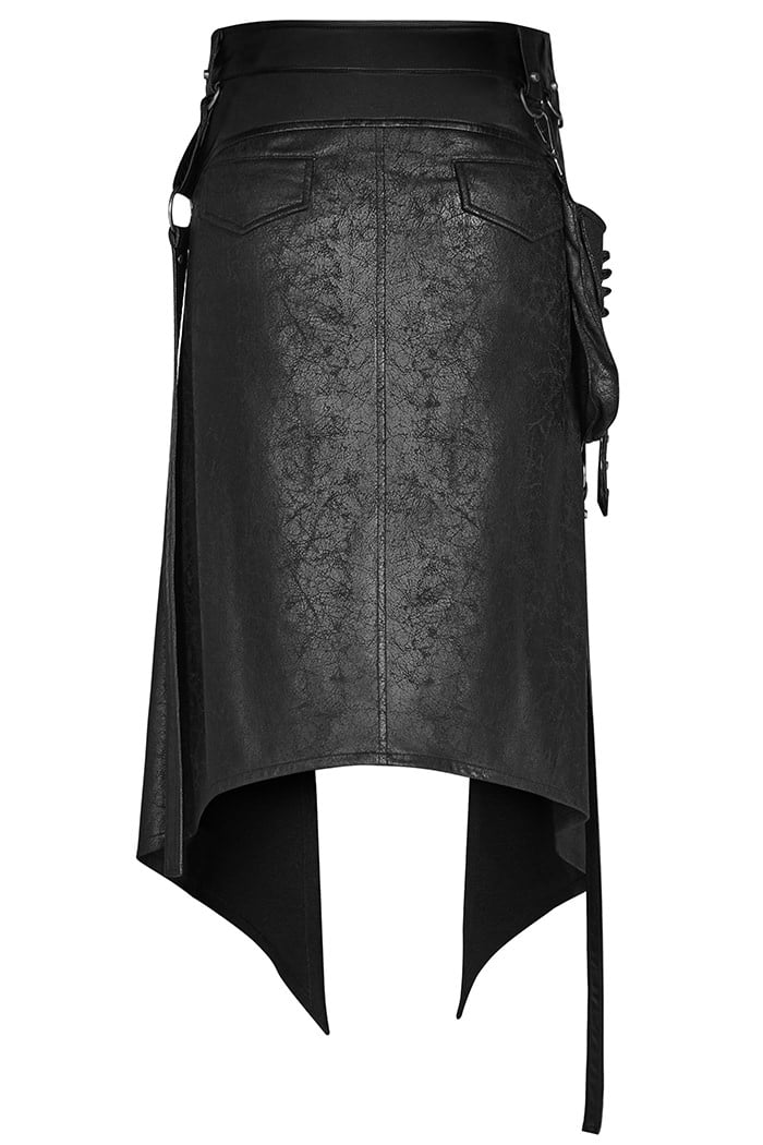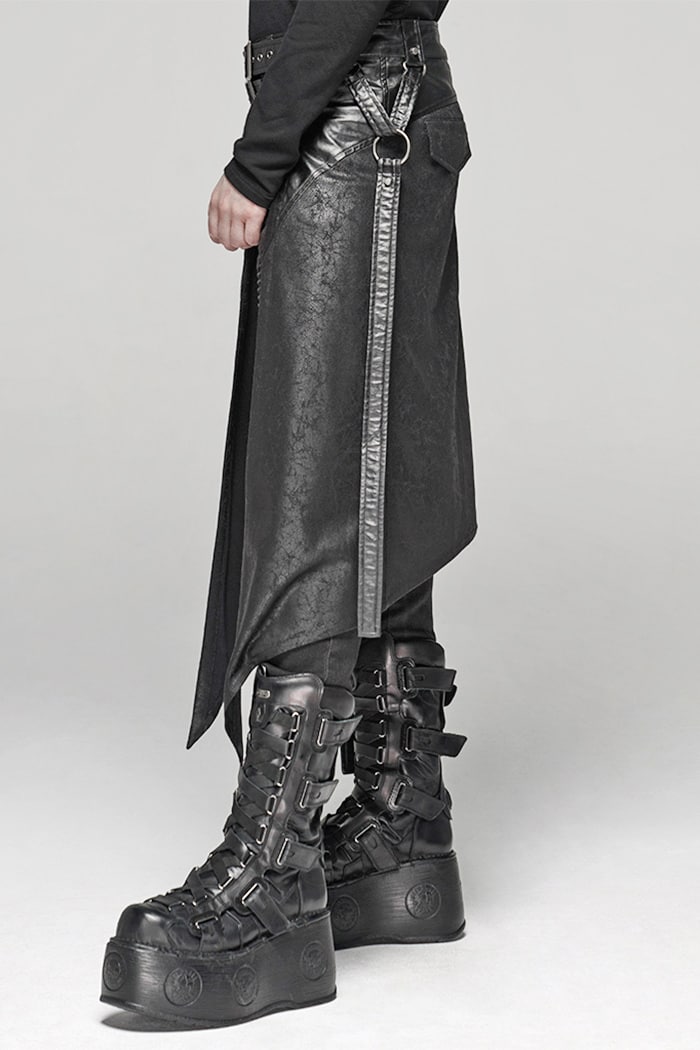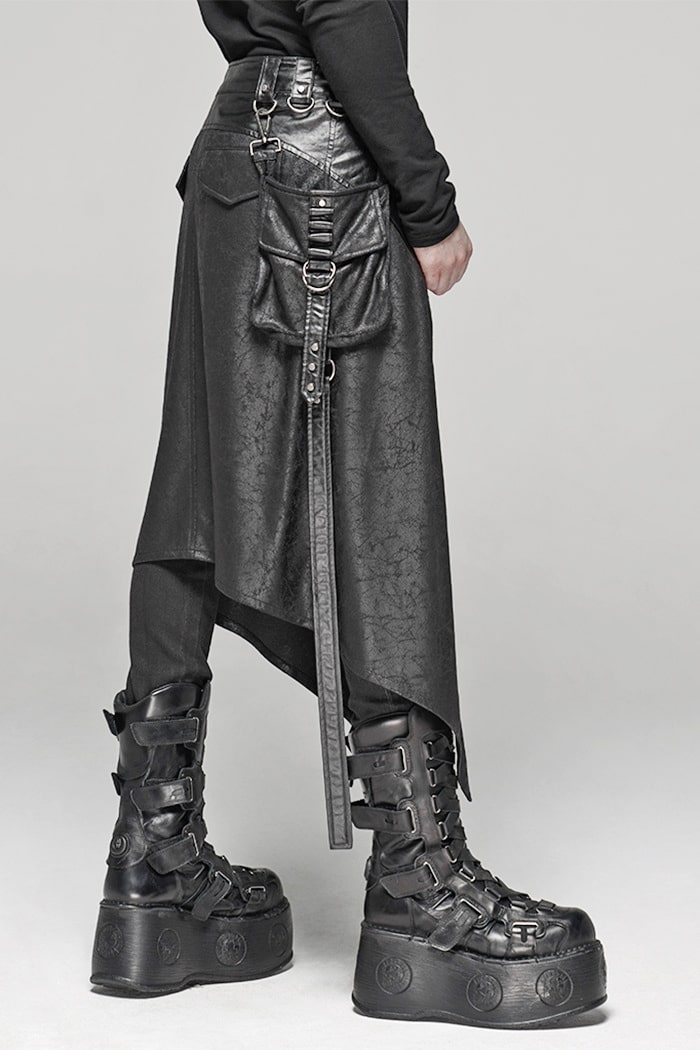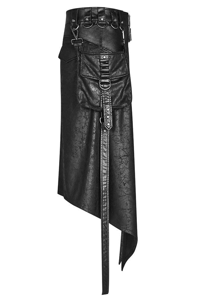 Gothic men’s skirt in imitation leather look made of light material. With two buckles on the waistband, equipped with two back pockets and a detachable side pocket. Decorated with straps, gray D-rings and rivets.