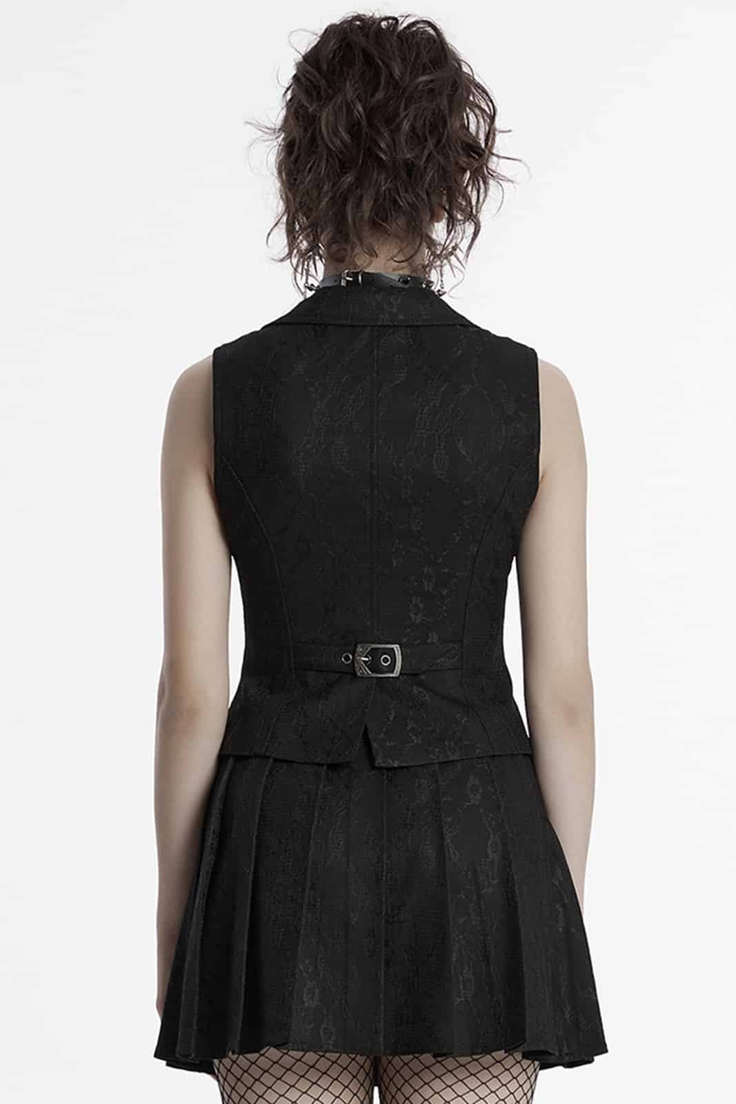 The Gothic Academy vest from Punk Rave is an elegant women’s vest in a Victorian-Gothic style. With its deep V-neckline and delicate lace trim, it combines classic romance with modern sophistication. The tailored fit and tapered hem emphasize the silhouette and make it a versatile piece of clothing for a variety of occasions.
