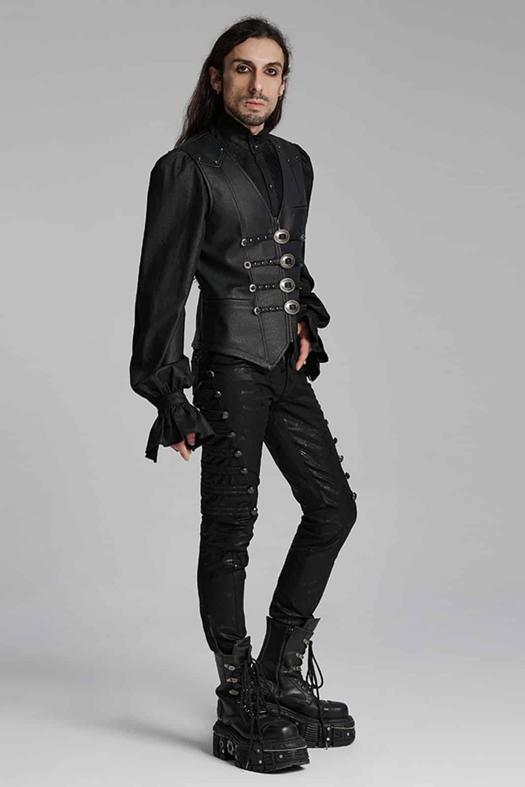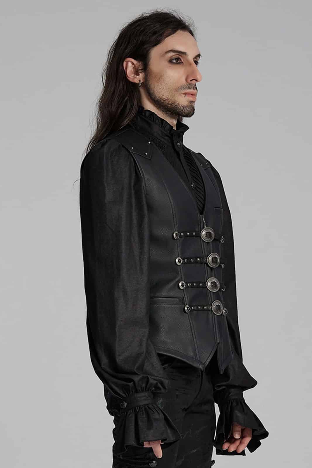 The cut is a subtle reminder of the structured heritage of 19th century menswear, where vests once signaled formality – but here the story takes a darker twist. The result? A garment that feels just as at home in a dark alley as it does behind the bar of an enchanted saloon.