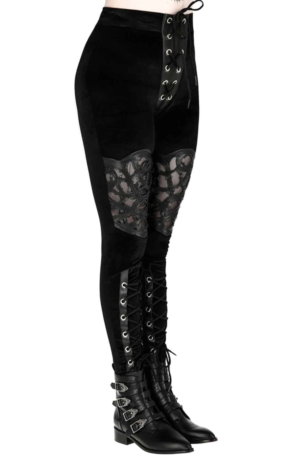 Gothic leggings made of luxurious velvet in rich deep black with a meticulous Gothic rosette pattern, presented using precise laser-cut technology on mesh fabric. The softness of the velvet offers a tactile pleasure that enhances comfort and style.