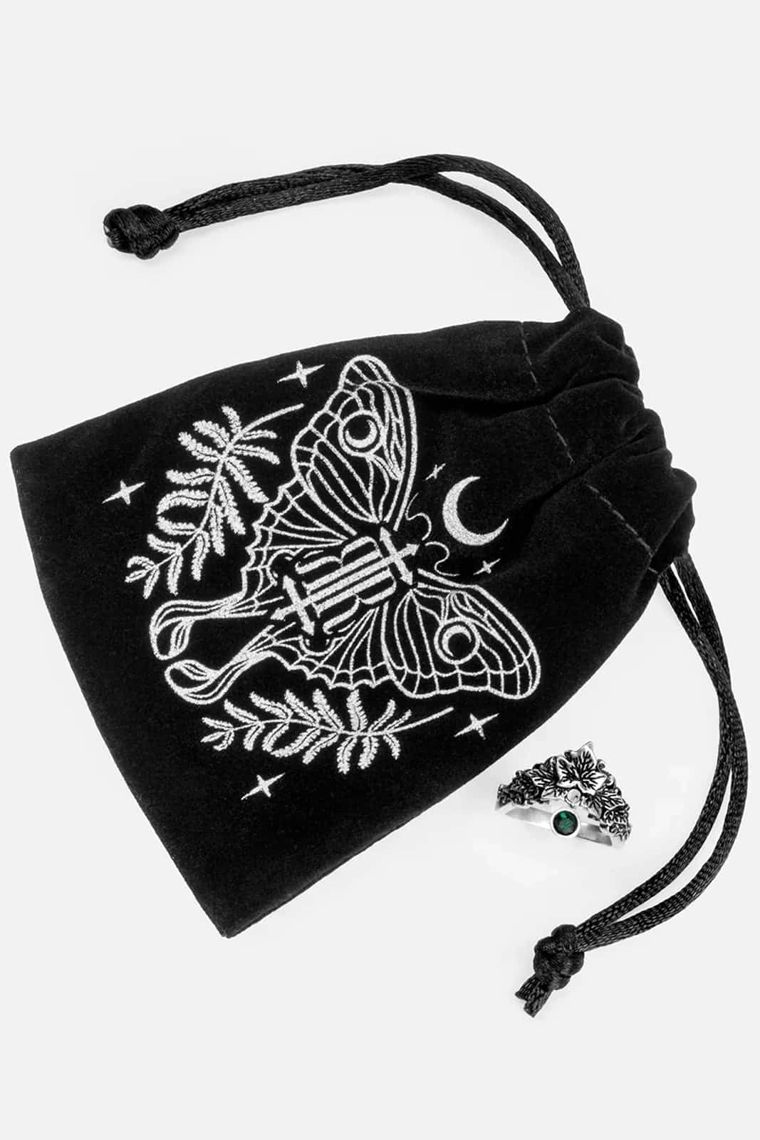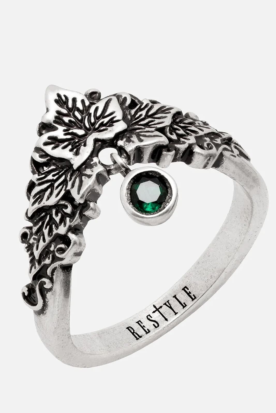 A ring whose name is as enchanting as its design – the Poisoned Ivy ring combines the fascination of dark nature with mystical elegance. An artfully designed ivy leaf rests on the ring shank in organic detailing, while a faceted emerald green crystal pendant shimmers underneath – like a hidden jewel in an enchanted forest. Perfect for lovers of forestcore, witchcraft jewelry and nature-inspired accessories – a subtle statement for fairy souls and dark romantics.