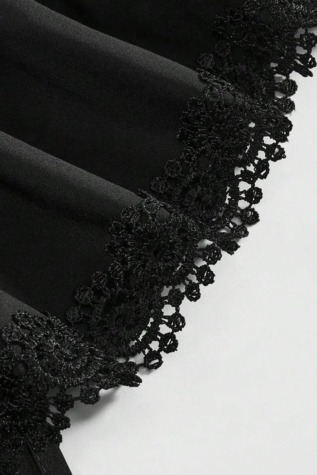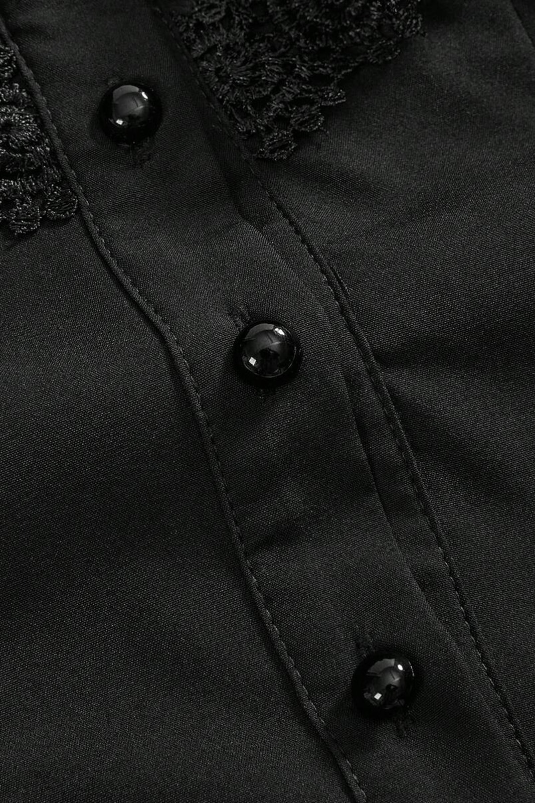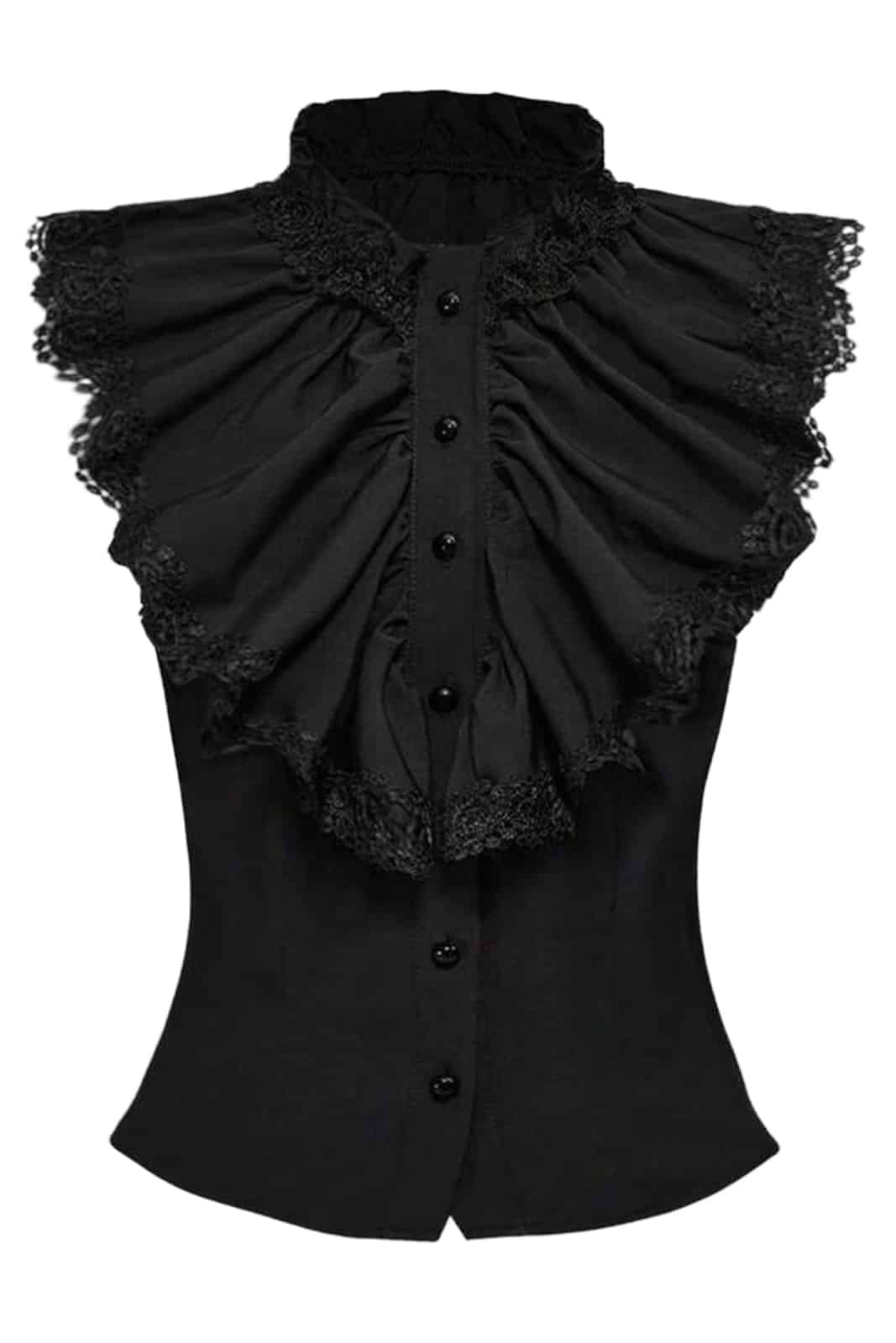 This gothic-inspired blouse combines romantic details with a touch of retro charm. The pretty ruffled collar with a delicate flounce lends the design a playful elegance. The full-length button placket at the front emphasizes the classic look and makes the piece versatile – whether as a stylish soloist or as a sophisticated layer under a dress or top. The sleeveless shape ensures lightness without sacrificing expression. Perfect for anyone who wants to combine feminine sophistication with dark aesthetics.