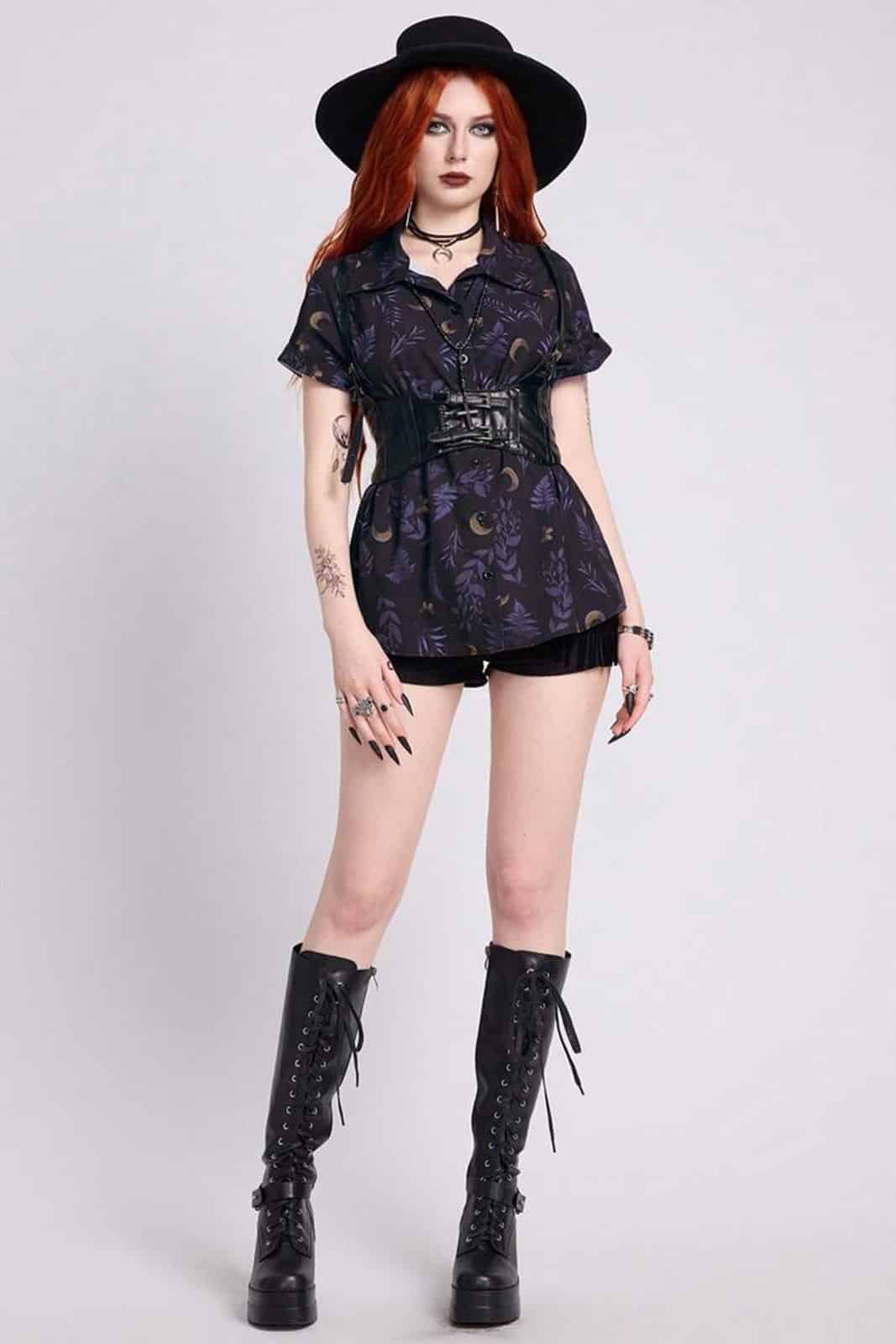 This short-sleeved blouse combines occult aesthetics with casual retro charm. The all-over print of moons and mystical plants gives the design a magical gothic touch that immediately catches the eye. The blouse buttons down the front and can be styled flexibly – open over a top or closed for a more elegant look. The small collar stylishly rounds off the cut and emphasizes the finely crafted details of this extraordinary piece. Ideal for anyone who wants to combine cosmic symbolism with urban casualness.