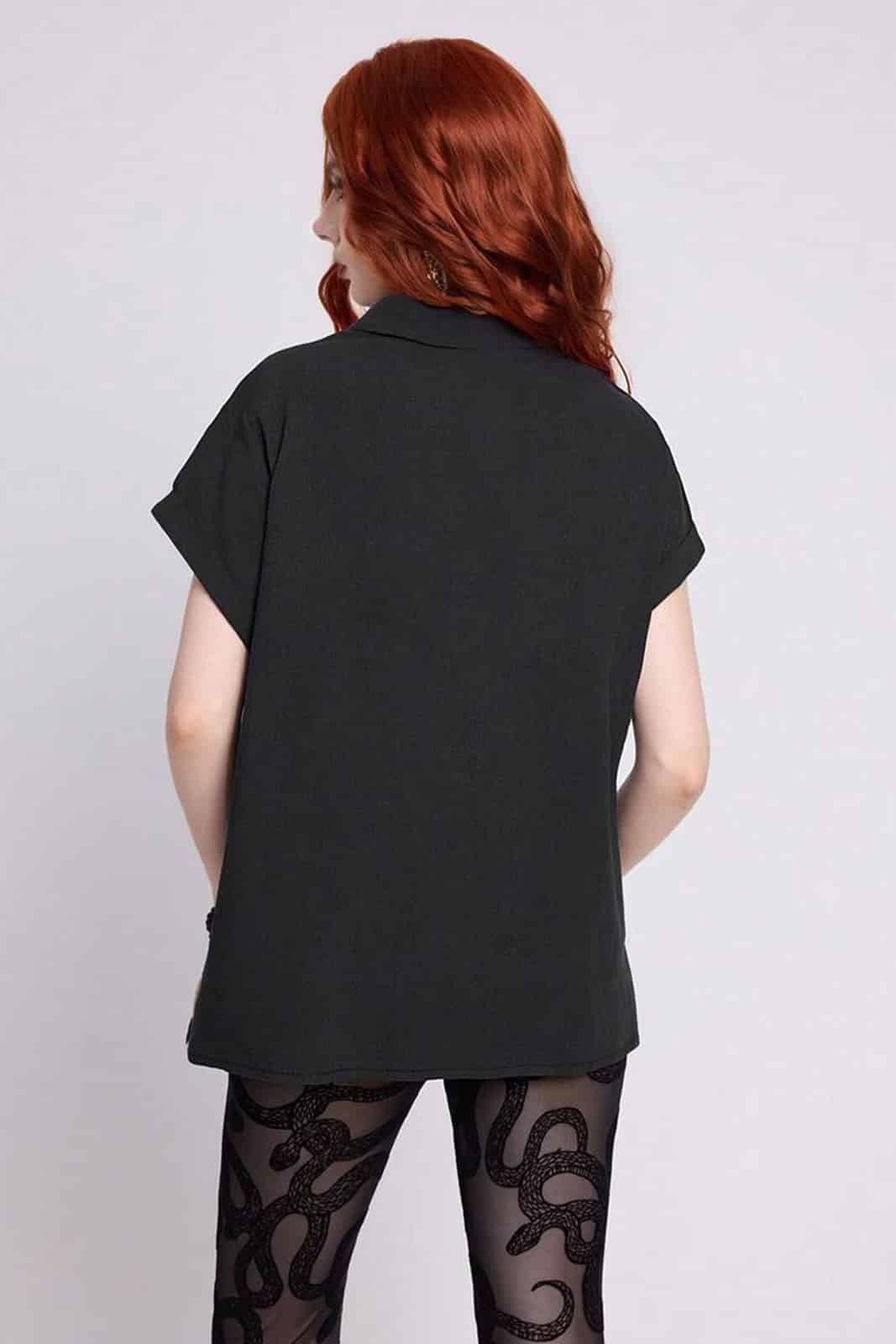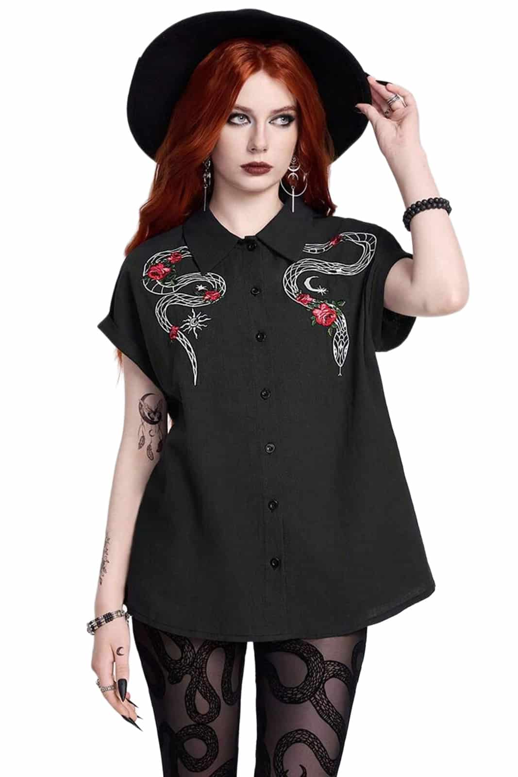 This loose black blouse combines mystical elegance with eye-catching embroidery. White snake ornaments entwine on the front, interspersed with red roses, moons and stars – symbols of seduction, change and nocturnal magic. With a classic collar, button placket and casual cut, it is both suitable for everyday wear and the perfect highlight for an occult-inspired outfit.