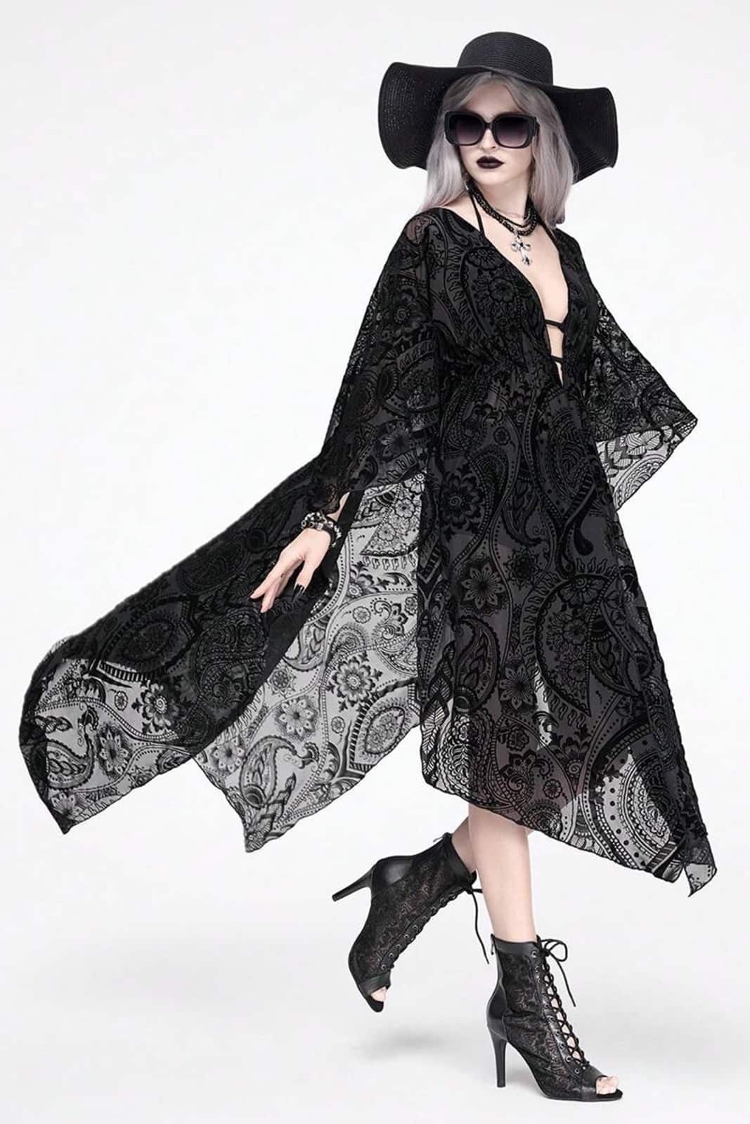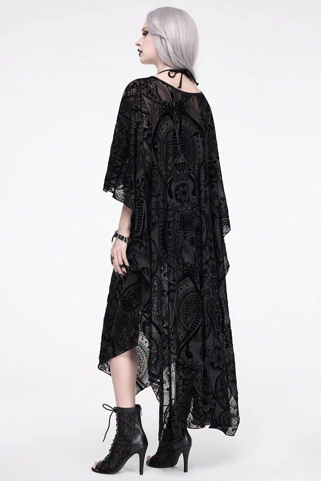 Veluris Noctem is a wrap like something from another world – a breath of dark veil, woven from a soft polyester blend and decorated with floral and occult-like ornaments. The fabric falls in dramatic lines, slightly asymmetrical, as if accompanying a silent ritual with every step.