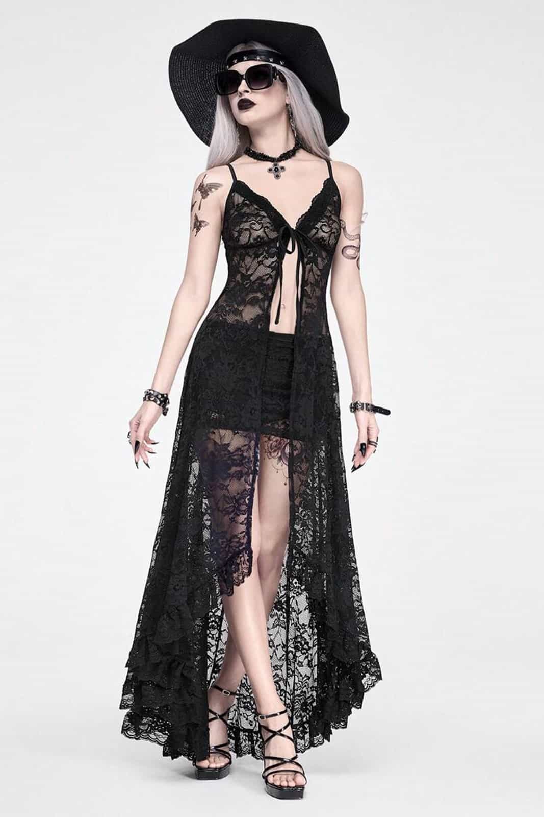 The delicate patterns of the lace are reminiscent of weathered stained glass windows, marked by the ravages of time, and lend the wearer an aura of dark romance and unapproachable elegance. Tied under the bust, the dress opens up into a dramatic drape that wraps around the legs like black mist.