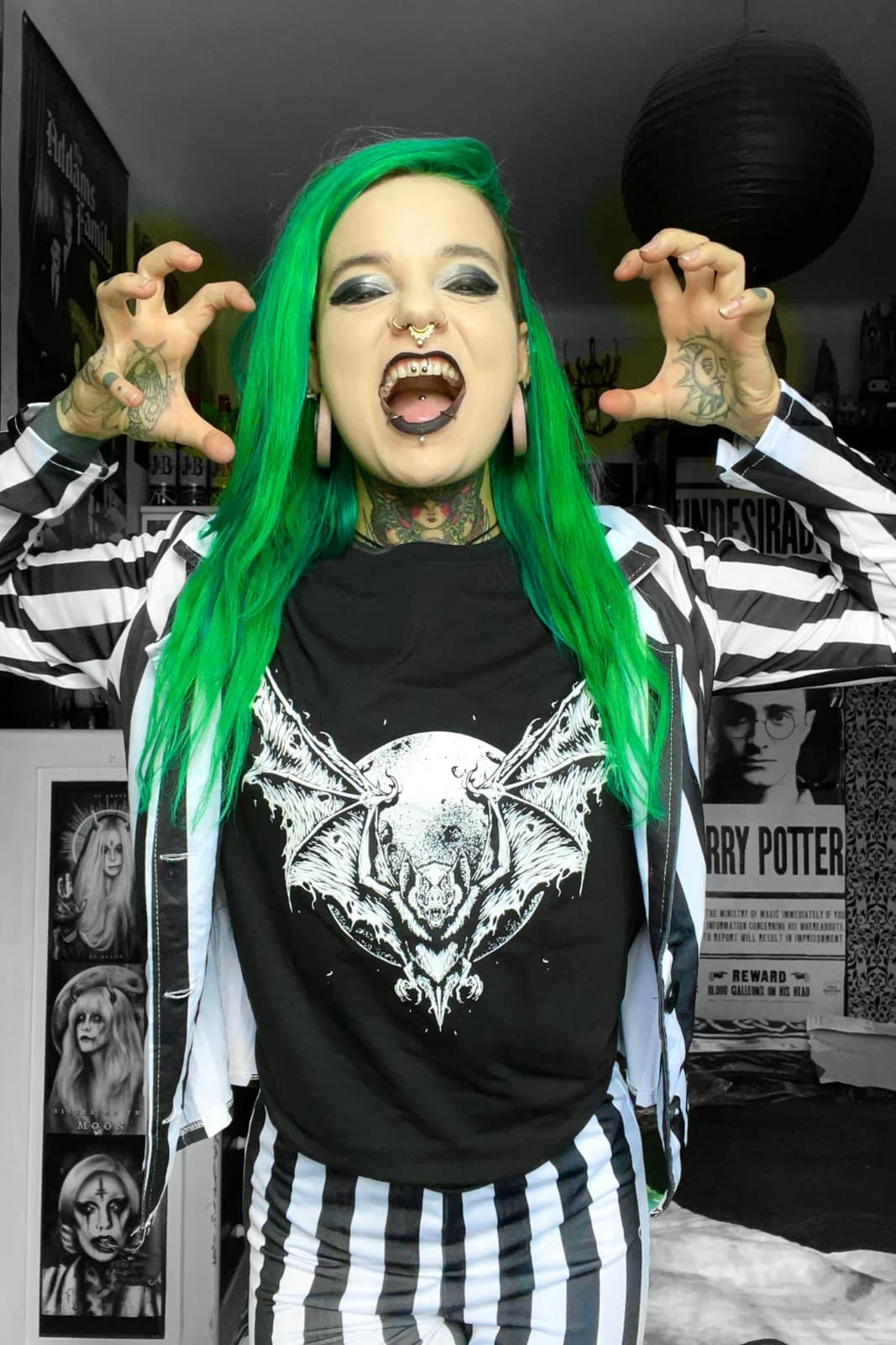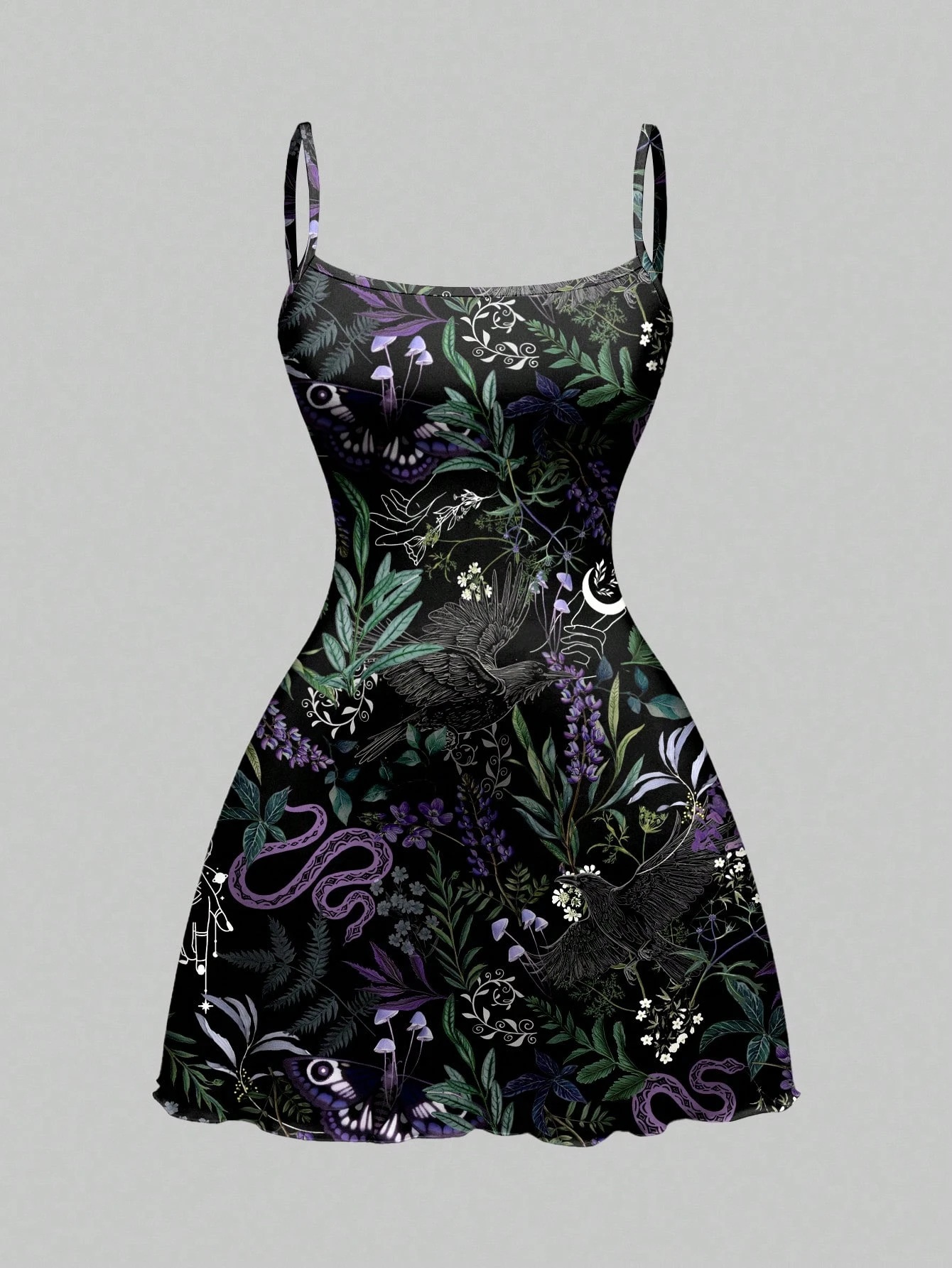 The Serpent Garden dress combines dark romance with mysterious symbolism. The detailed pattern features snakes, ravens, butterflies and floral elements in deep shades of green, purple and black – like a nocturnal witch’s garden full of life. The fine spaghetti straps and feminine cut emphasize the silhouette and give the dress a light, flowing elegance. Perfect for magical summer nights and moonlit walks.