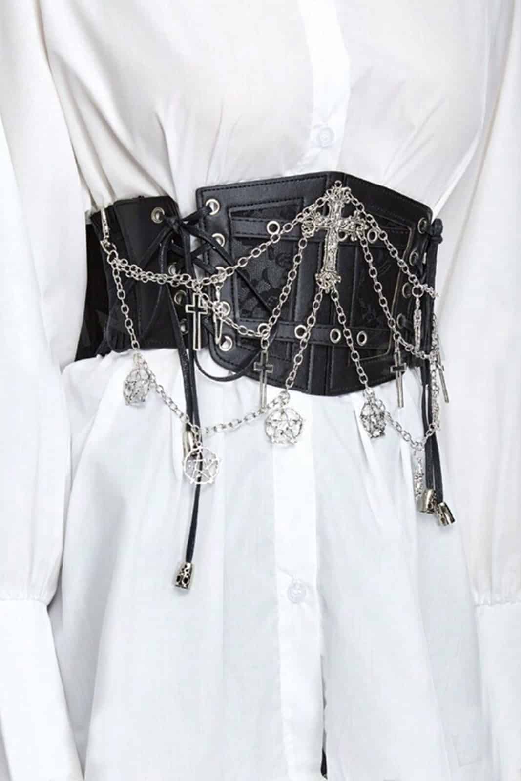 Bodice belt made from a high-quality faux leather front panel with an elastic back band fitted with press studs. The front also has side lacing to adjust the bodice perfectly to the waist. Decorated with crosses, spider webs and silver chains.