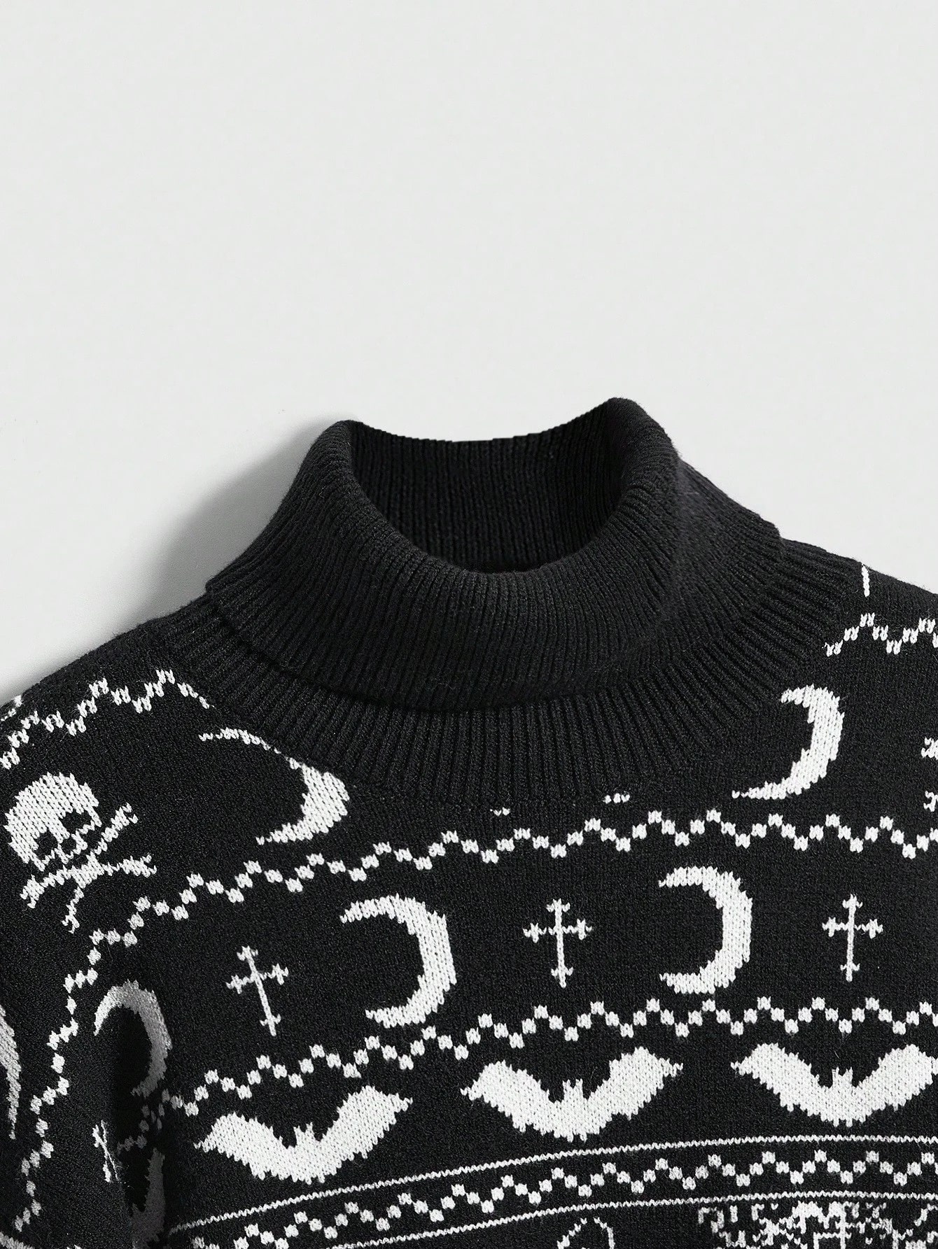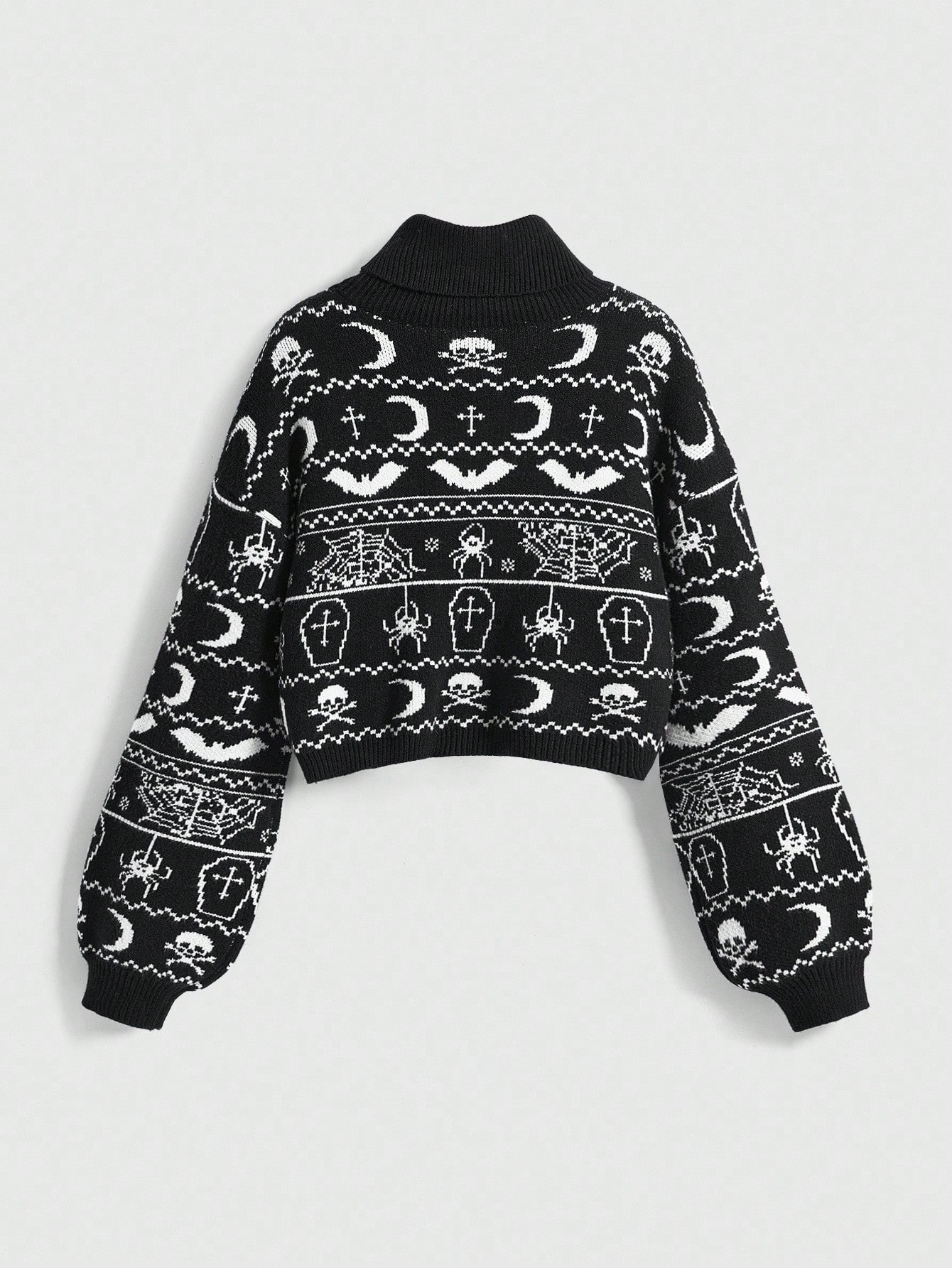 The Graveyard Whispers pullover is a statement piece for dark fall nights. The jacquard pattern features moons, crosses, bats, spiders and skulls – a tribute to the aesthetics of old graveyards and mystical symbols. The soft turtleneck ensures comfortable warmth, while the loose fit and voluminous sleeves add a modern finish to the design. Perfect for anyone who loves a cozy yet gloomy look.
