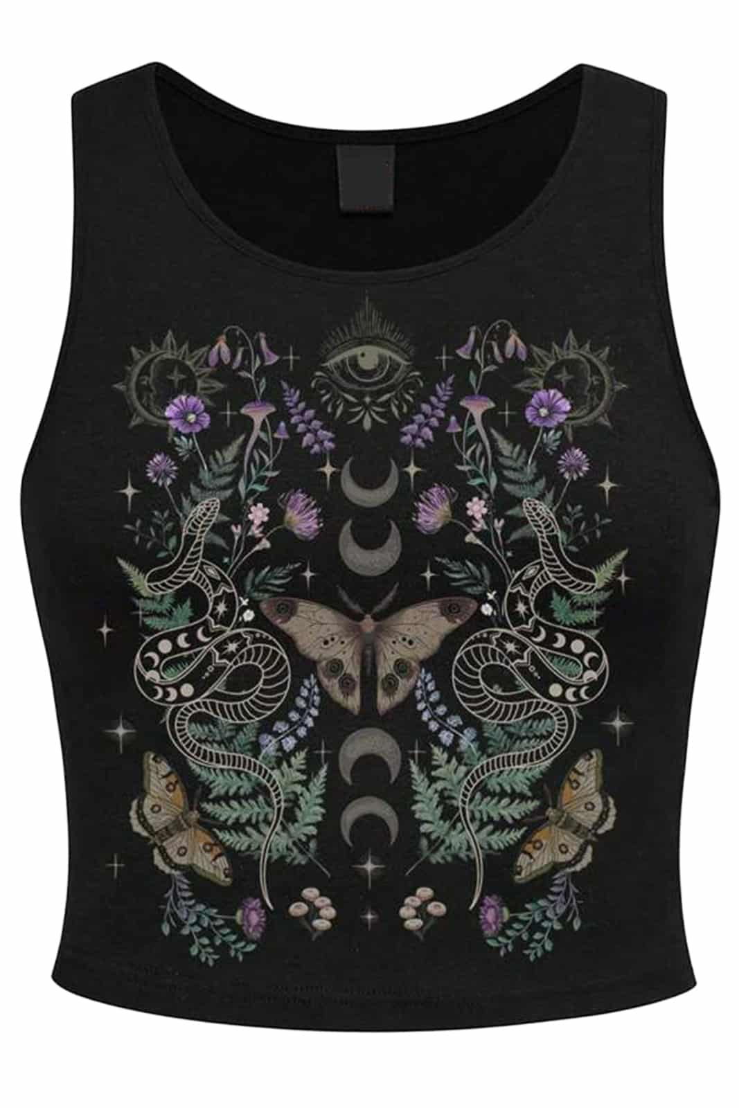 This sleeveless top with a round neckline combines mystical symbolism with a modern cut. The detailed front print features plants, a butterfly, snake, stars, moon, mushroom, eye and sun – perfect for anyone who wants to combine nature motifs with occult aesthetics. The soft, stretchy material fits snugly to the body and is extremely comfortable to wear. Ideal for summery outfits with a touch of gothic magic.