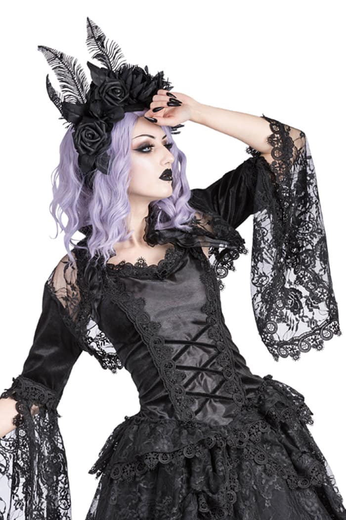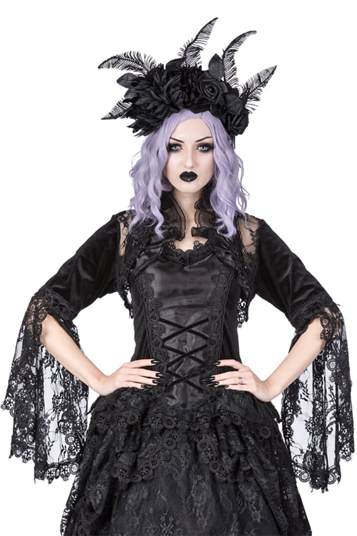 Romantic gothic bolero jacket made of airy lace with rose and paisley motifs. The sleeves are made of soft velvet and have a wide lace ending. The collar made of a double layer of organza ruffles is a great eye-catcher. Decorated with luxurious lace borders.