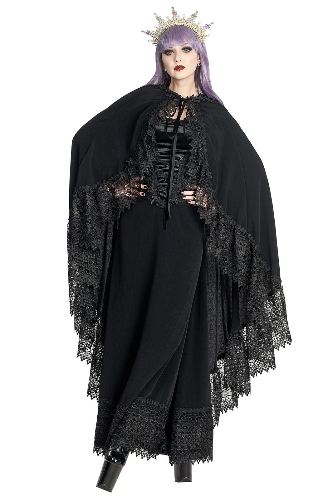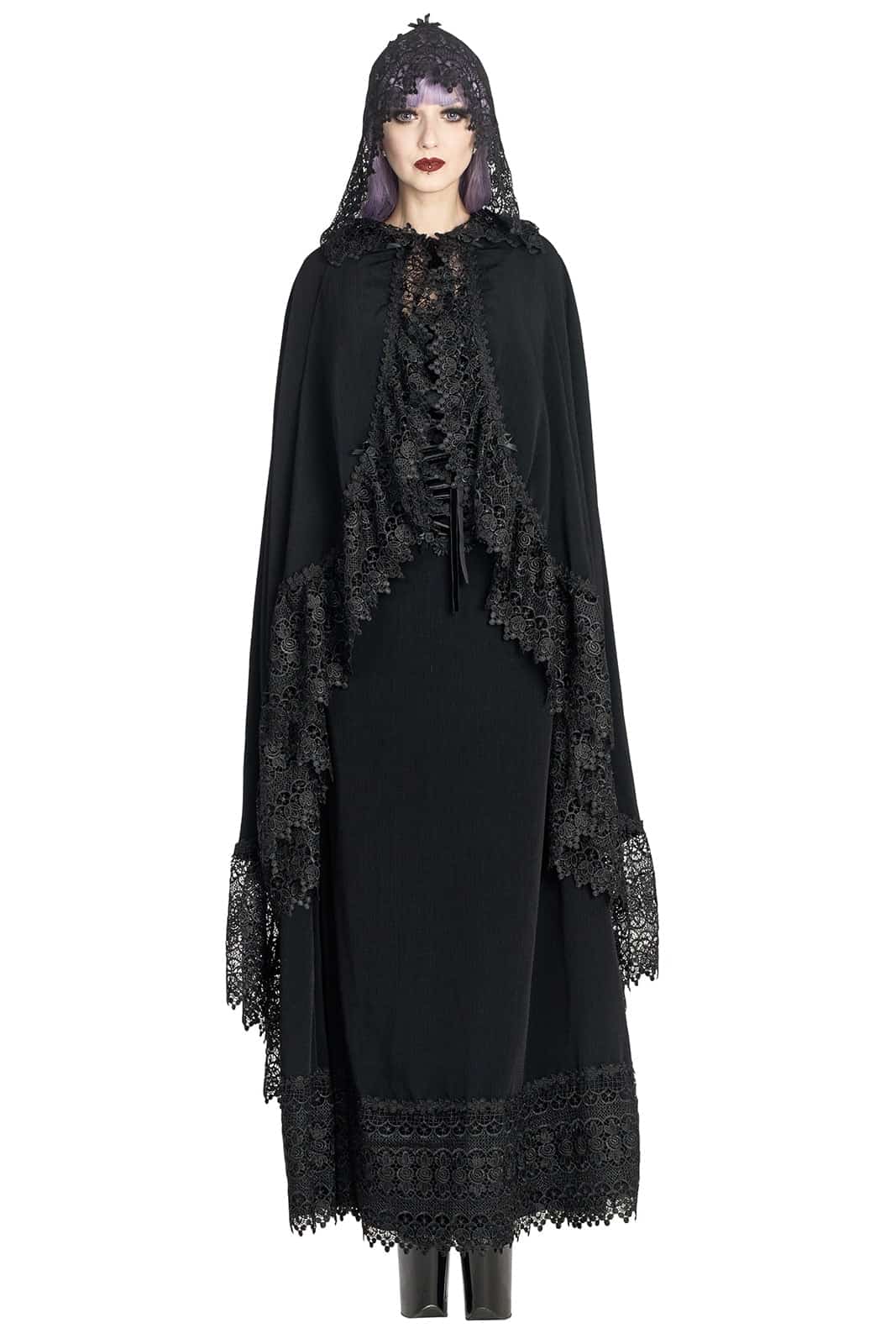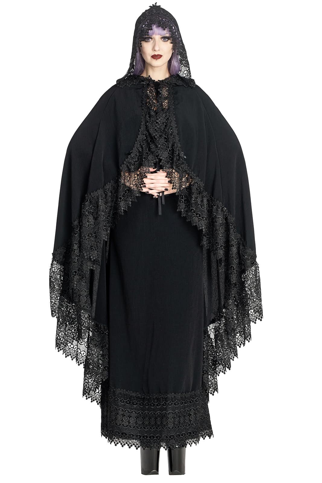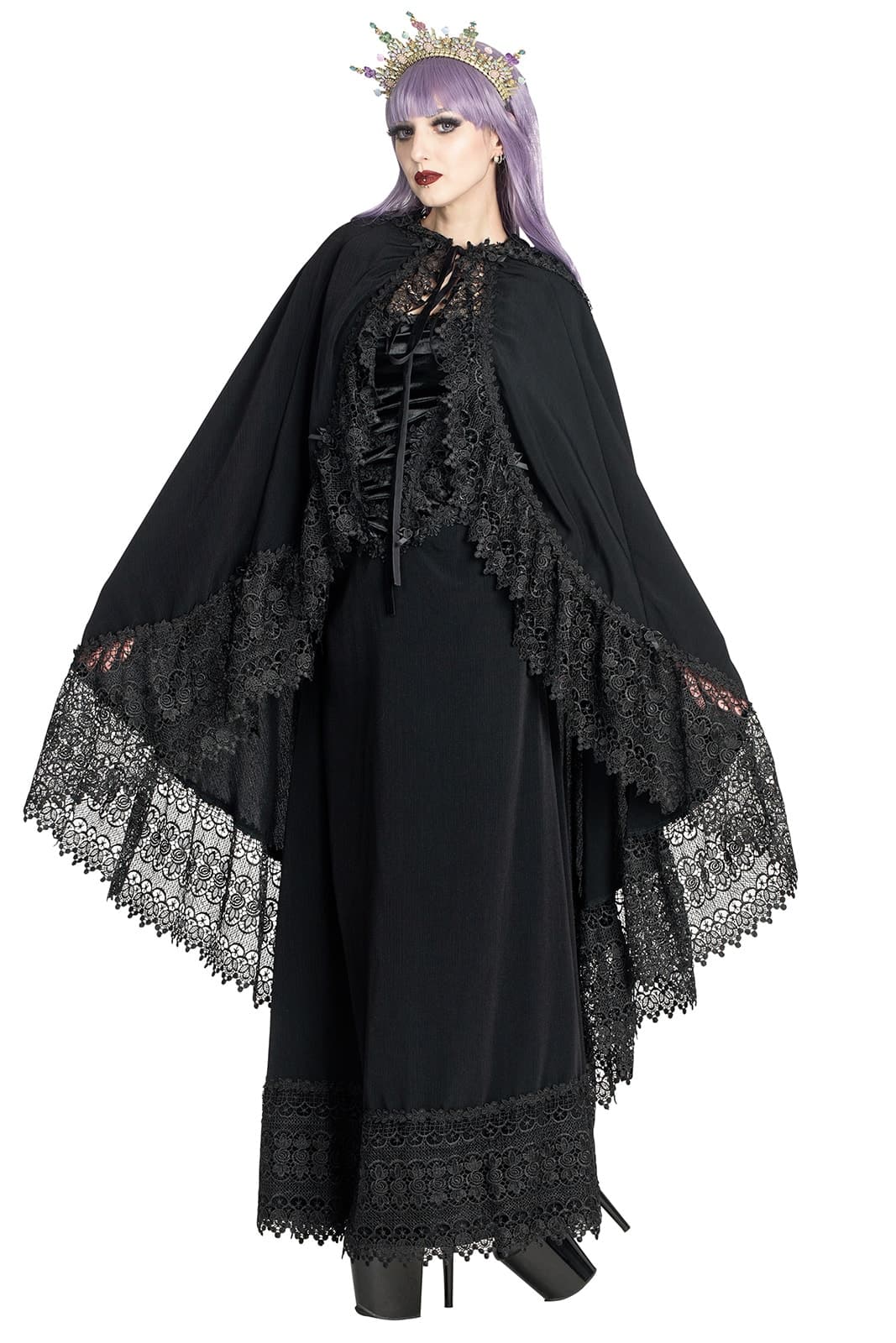 This breathtaking gothic cape lends every appearance a mysterious, almost supernatural aura. Made from flowing black twill, it drapes elegantly and envelops the silhouette with dramatic lightness. The large hood is decorated with a satin bow and elegant brocade lace, while finely crafted lace edges and small satin roses adorn the edge. When opened, the cape unfurls wing-like panels – an impressive detail for magical appearances.