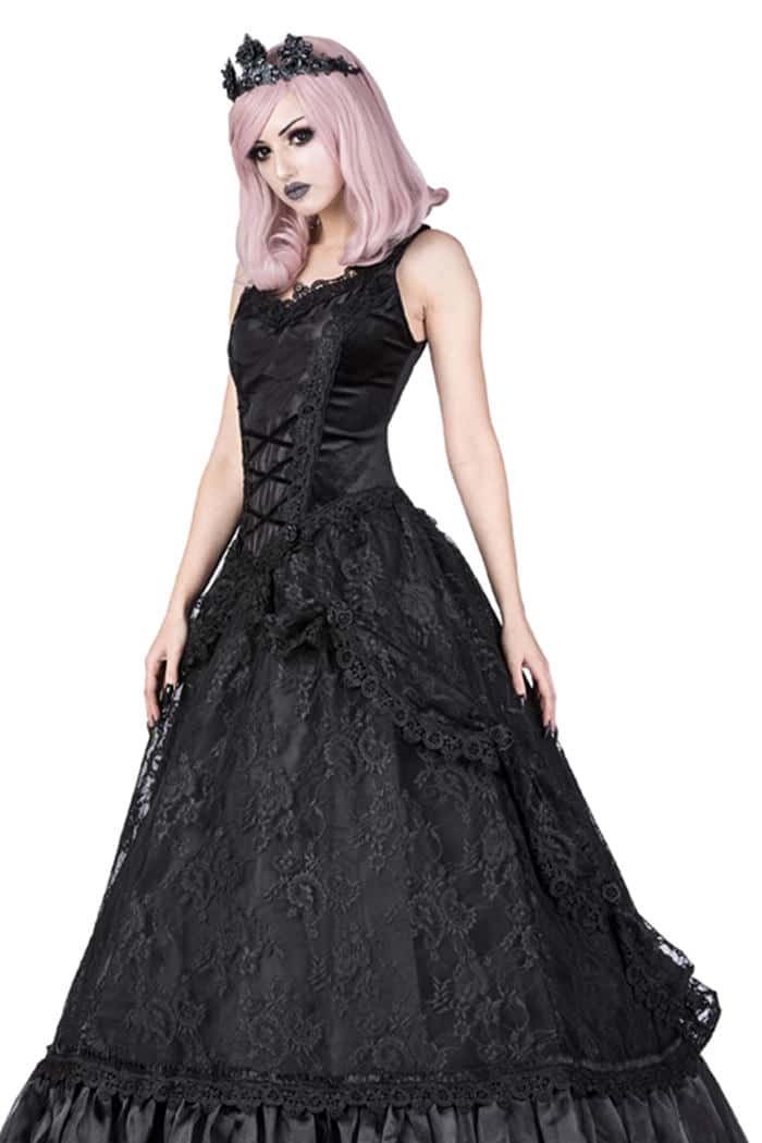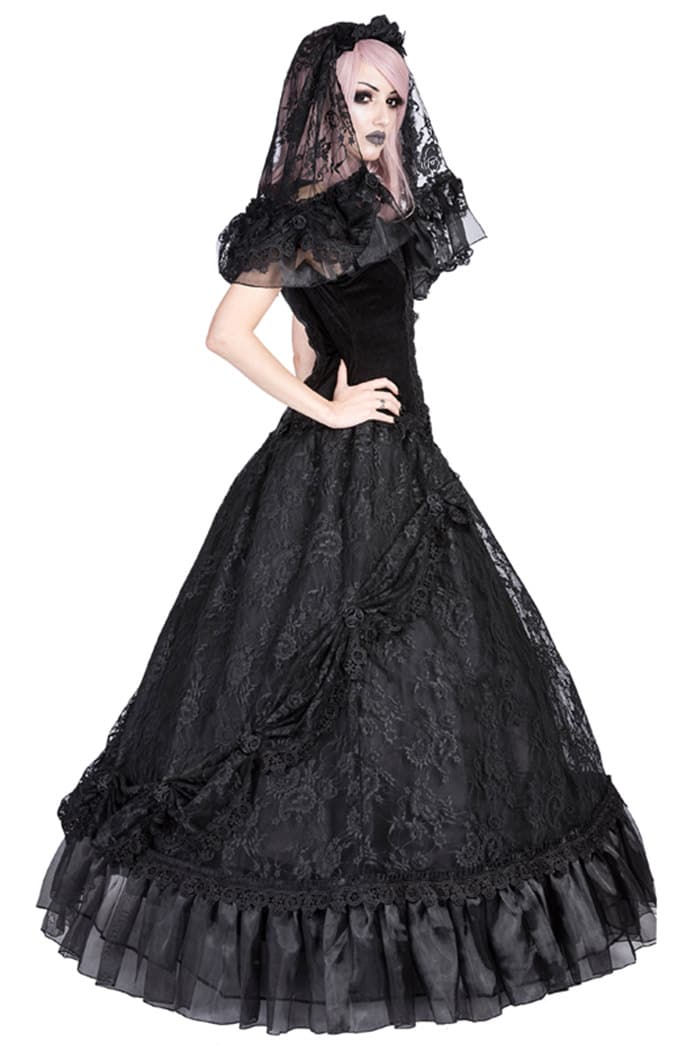 Elaborately designed gothic dress made of velvet, lace and tulle. Crafted from soft velvet, the sleeveless bodice features satin panels with lustrous organza overlays and narrow velvet ties at the lower front. The skirt part consists of a layer of solid tulle and provides expansive volume. Above this are two layers of fine lace with rose and paisley motifs. One of these layers is gathered with small satin roses, the other has a beautifully shiny organza flounce. Both layers of fabric are decorated with lace borders. Equipped with satin lining.