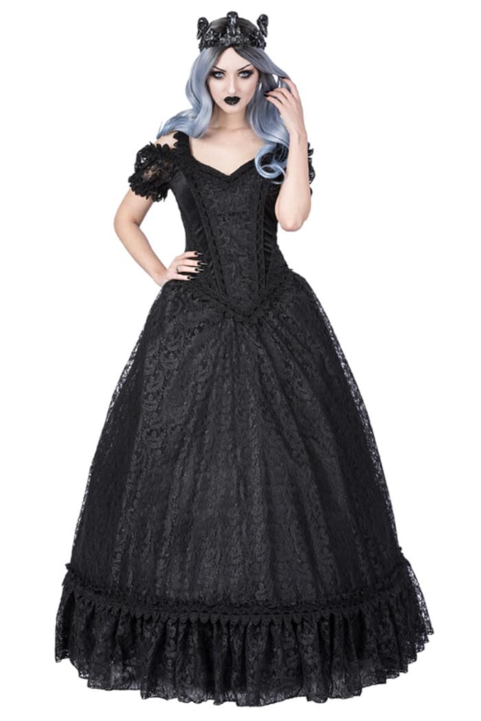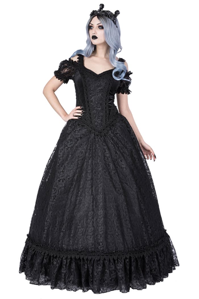Medieval style gothic dress made of velvet, lace and tulle. The top made of soft velvet has elastic straps and short off-shoulder puff sleeves. With a beautiful, figure-hugging lace overlay. The skirt part consists of a layer of solid tulle and provides expansive volume. A layer of softly falling lace is placed on top. The dress is richly decorated with lace borders. Equipped with satin lining.