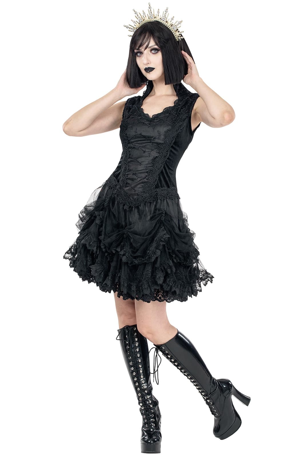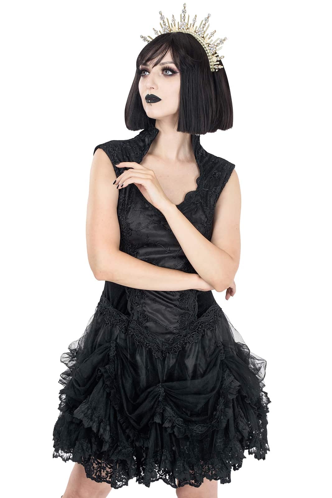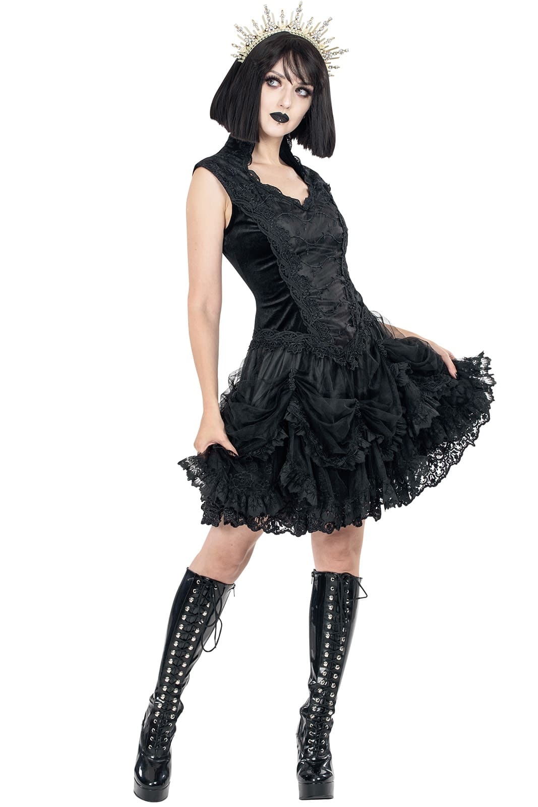 Delicate gothic Lolita mini dress with a multi-layered skirt made of soft mesh and embroidered lace. The fitted velvet bodice has a discreet vampire collar with a heart-shaped neckline decorated with brocade lace trim. The satin front of the velvet bodice is covered with an overlay of newly embroidered French lace and trimmed with wide brocade lace trims on both sides and around the waist. The flowing skirt consists of two different layers: the top layer is made of soft, black net gathered by a row of black satin roses and is trimmed with Venetian lace and black lace ruffles. At the bottom, a wide layer of ruched, newly embroidered lace completes the perfect look. The skirt is fully lined with silky soft satin and the dress has a concealed zipper at the center back.