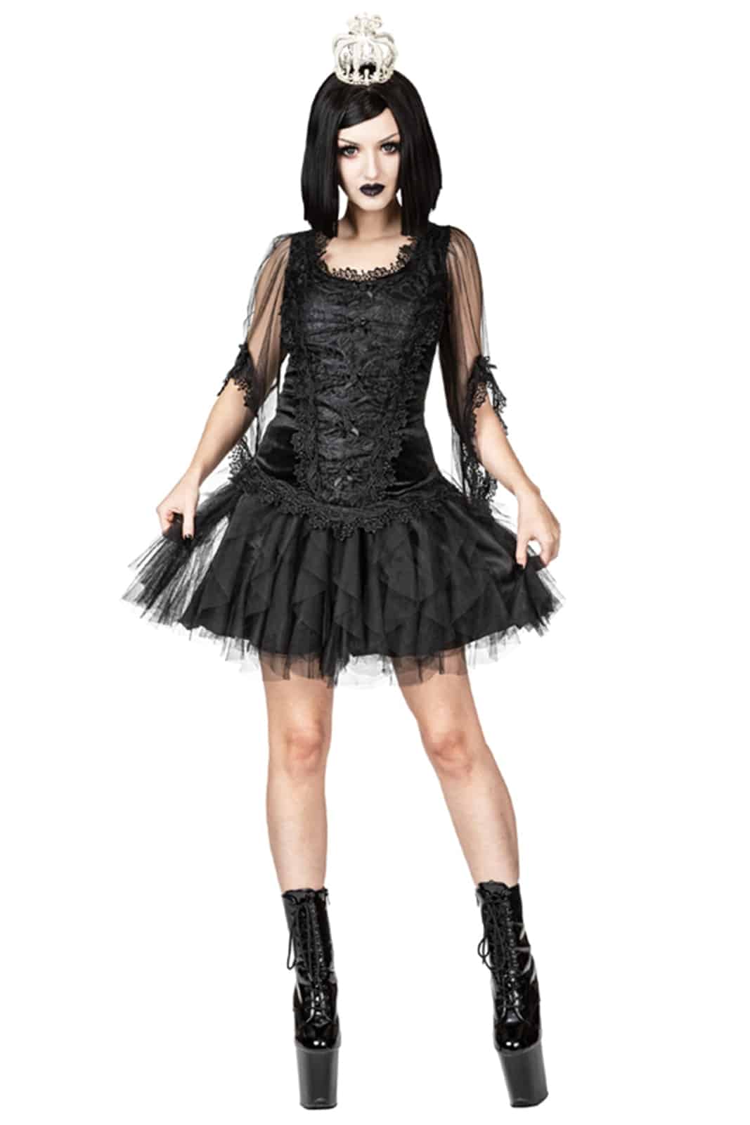 Black Lolita mini skirt made of mesh fabric, consisting of two layers: The top layer consists of a soft black mesh fabric that is decorated vertically with several layers of soft black mesh fabric to create a full and flowing effect. The skirt is fully lined with black satin and has an elastic waistband with a concealed zipper at the side for a perfect fit.