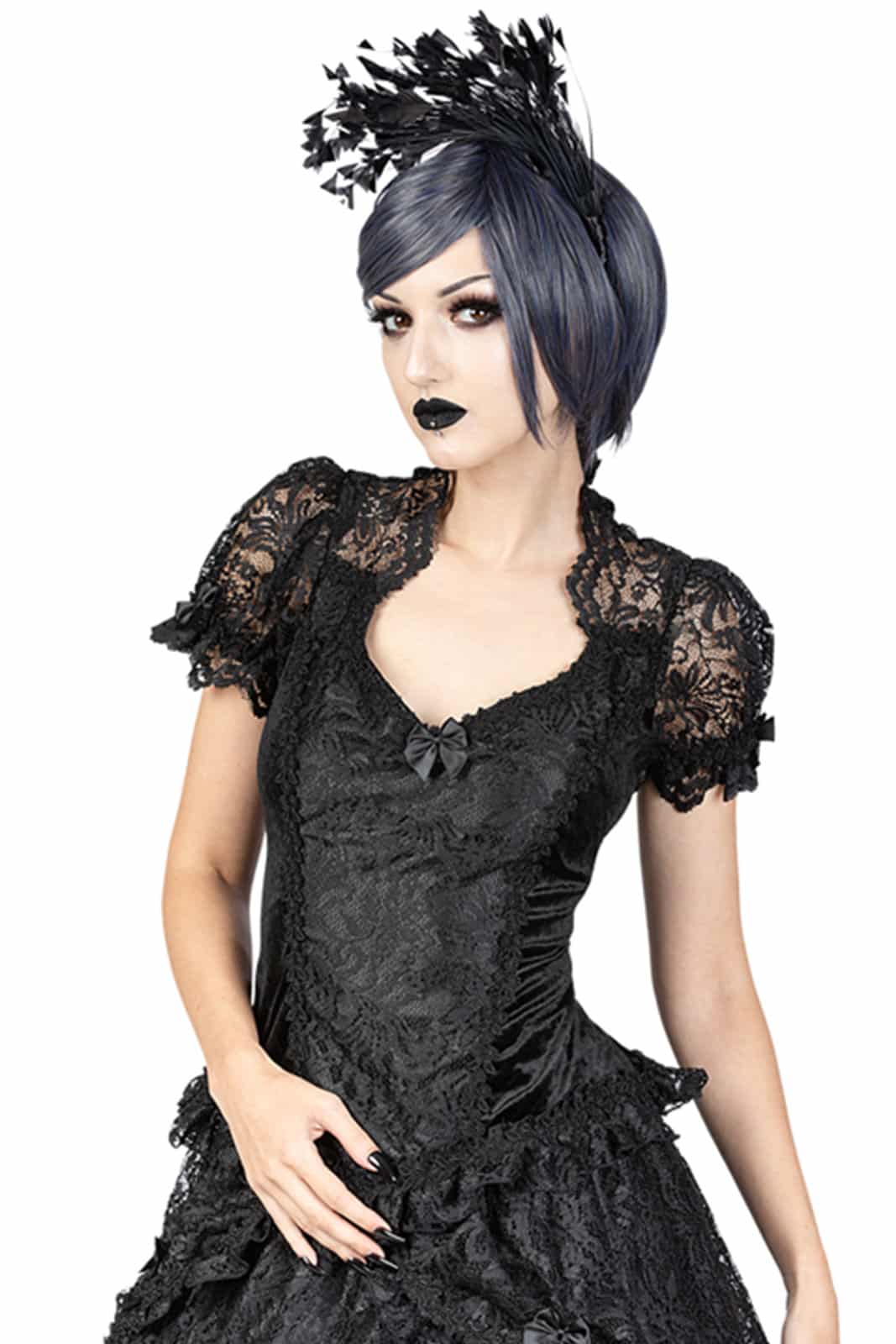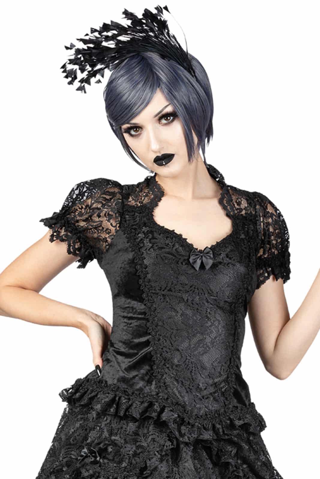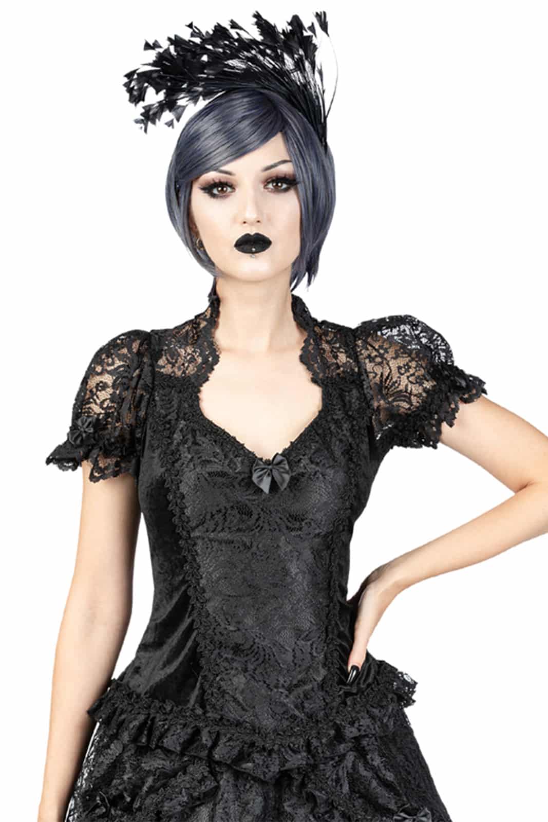 Classic Victorian gothic top with diamond neckline and black lace collar. The puffed sleeves in Sicilian lace are elastic, have a leaf-shaped trim and are decorated with a large satin bow. The satin front panel of the velvet bodice is embedded with a Venetian lace overlay and adorned with black lace trimmings. A black lace ruffle is trimmed with Venetian lace all over the hem. The high back is black lace and has black velvet on the lower back. A zipper is located on the back of the bodice.