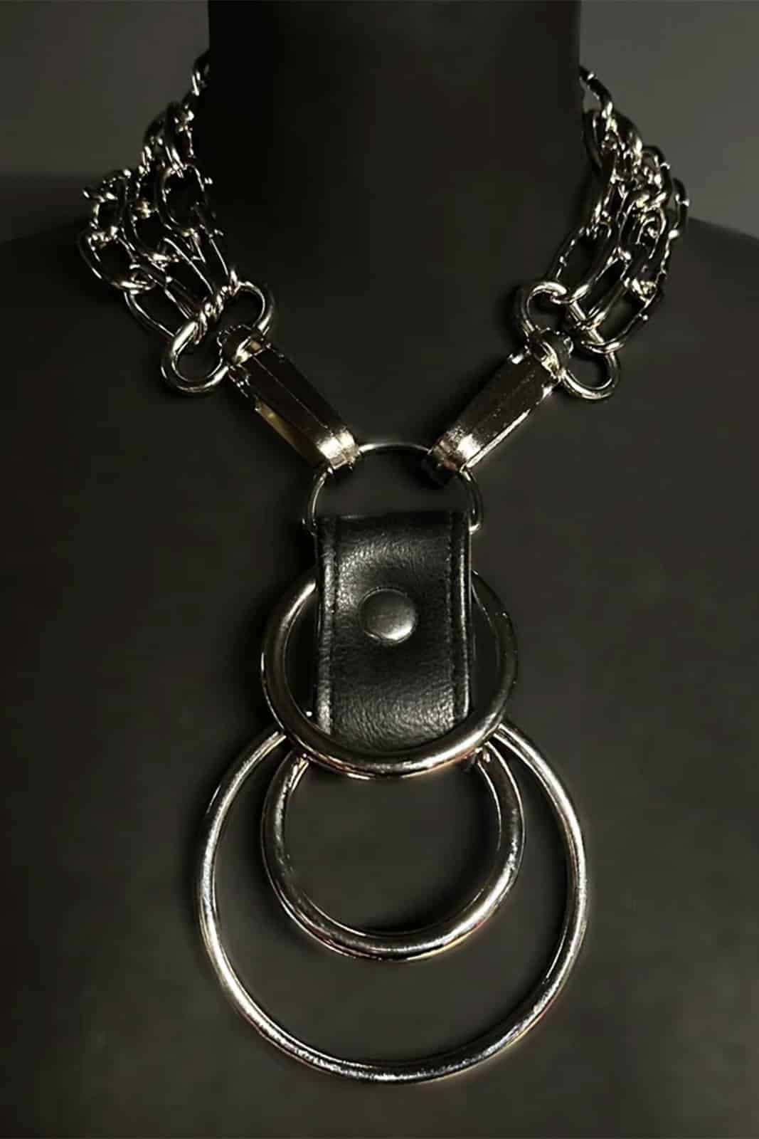 This eye-catching necklace combines vegan leather with solid chains and striking rings. Three O-rings hang from a D-ring, which is fixed with a leather bar and gives the design a powerful focal point. The necklace closes with two clips that connect the D-ring to three sturdy chain strands that wrap around the neck. An expressive accessory for a strong, edgy statement.