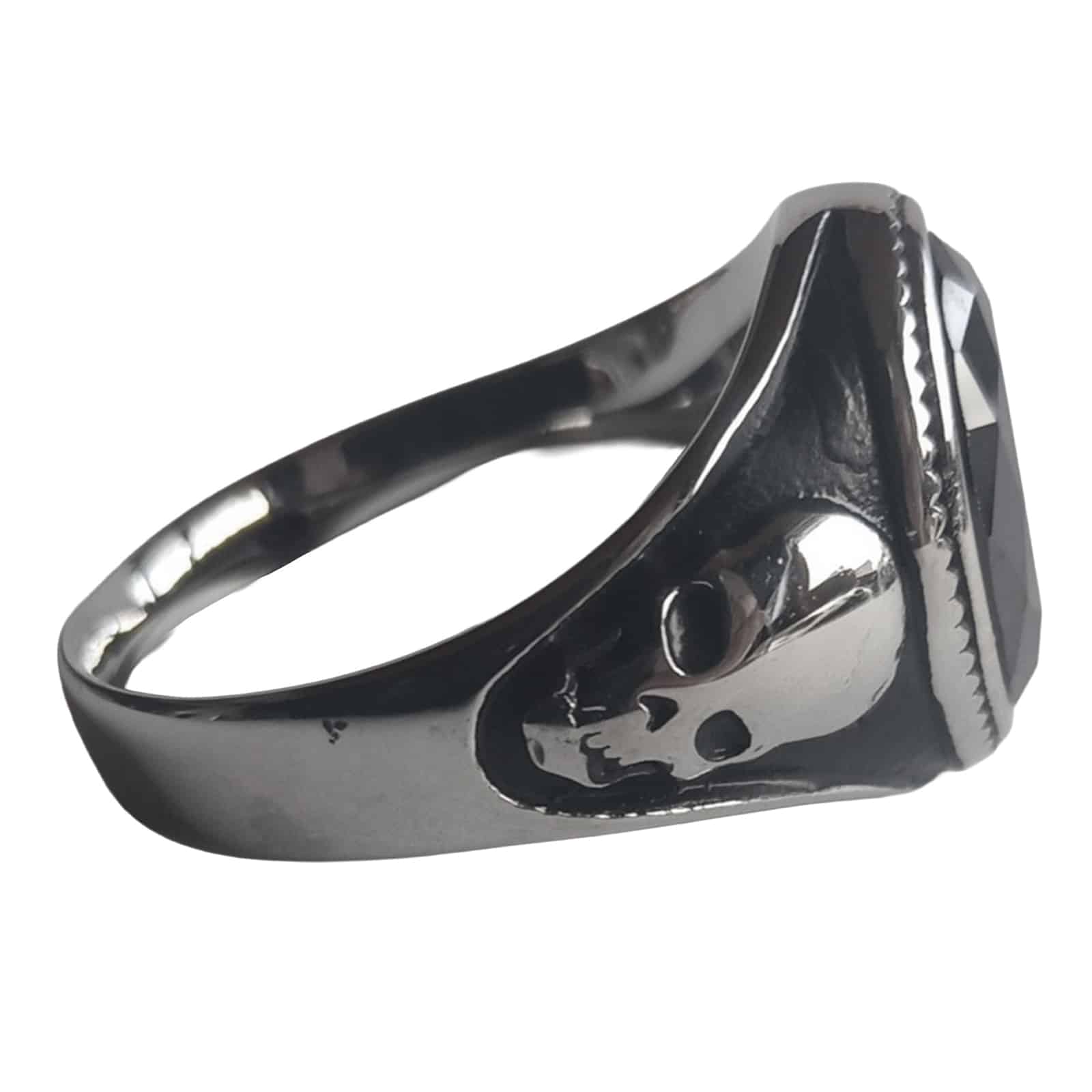 Expressive ring made of shiny surgical steel with skull details incorporated into the side. The dark, faceted stone forms the focal point and gives the ring a mysterious, dark aura. A striking piece of jewelry for anyone who wants to combine strength, rebellion and dark elegance.