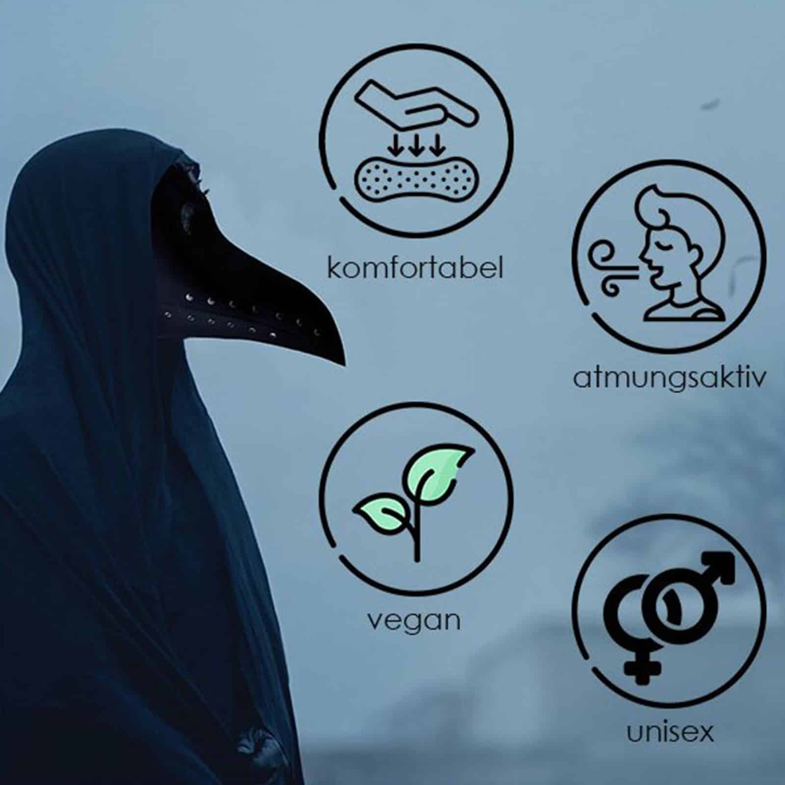 High-quality imitation leather mask in the shape of the plague doctor. Decorated with flat studs on the beak and pointed studs on the forehead. With elastic band for perfect wearing comfort. With air holes along the beak for optimum air circulation.