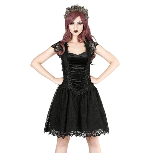 Short gothic mini dress made of velvet, lace and satin. Voluminous skirt part with a beautiful lace overlay, decorated with small bows. Delicate lace cap sleeve bodice.