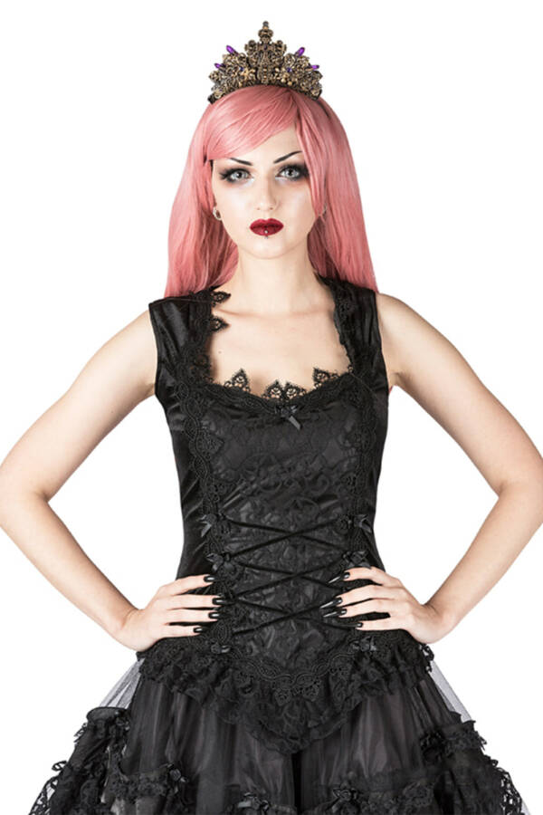 Sleeveless gothic mini dress made of velvet and satin with a beautiful lace overlay, decorated with tulle flounces, lace borders and small satin roses.