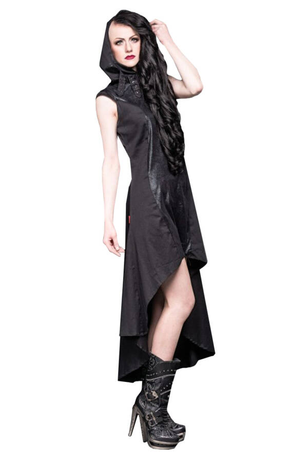 Pure modern mystic! Long, high-necked hooded dress, cut short at the front. The entire style ensures a futuristic look.