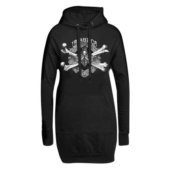 Gothic hooded long sweater made of high-quality cotton with a large skull print and a large kangaroo pocket. Perfect to combine as a mini dress or long hoody with leggings or fishnet stockings.