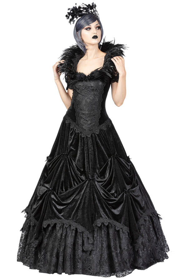 Become a rare bird yourself in the enchanting Rara Avis ball gown. The lush neckline is adorned with beautiful feathers. Short lace sleeves cover the shoulders. A zipper in the back helps you put it on and take it off quickly. The swinging skirt part is divided into several tiers. In the upper area made of soft velvet. Finest lace below. Completely lined with a satin lining. The middle of the front of the upper part consists of a slightly shiny material covered with delicate lace. The sides and back are made of velvet material, decorated with lace trims.