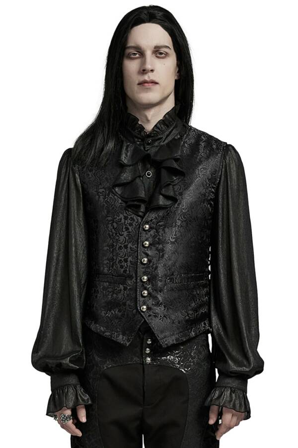 Victorian-style gothic vest in a classic, fitted cut, made from black, embellished satin jacquard fabric and with a V-neckline without lapels. With lacing at the sides for an adjustable fit. The antiqued metal buttons add a vintage and elegant touch.