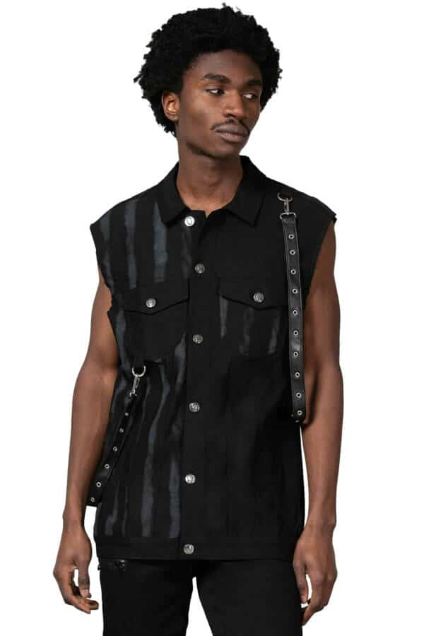 Vest made of stretchy material with full-length button placket. Decorated with removable straps and motif buttons. Equipped with two breast pockets. The front is printed with contrasting gray stripes.