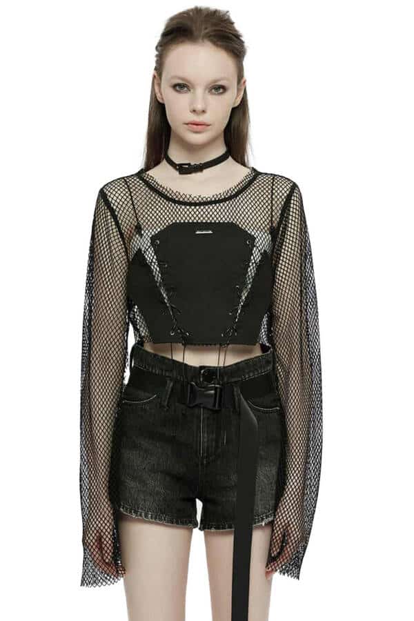 Long sleeve mesh top with opaque front panels. Cut short in a crop style with a lace-up detail at the front.