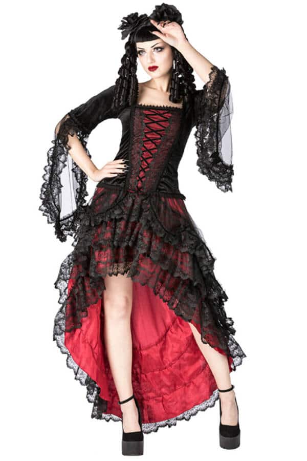 Beautiful gothic skirt made of satin, with a lush tulle overlay, finely decorated with lace flounces and velvet bows. Equipped with elastic waistband.