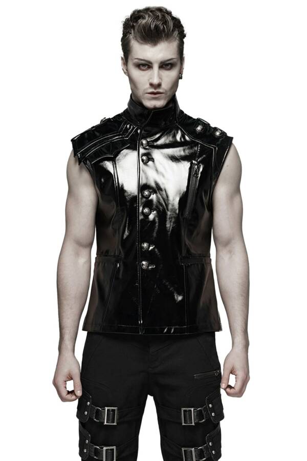 Shiny men's vest made of high quality synthetic leather with front button closure.