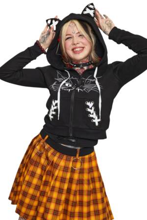This alternative hoodie creates a playful gothic look with cat power. An eye-catching cat print is emblazoned on the front, while the hood features cute kitty ears. The long fit with a zipper, practical pockets with lace-up details and classic black make it a versatile piece that can be perfectly combined - whether for leisure, festivals or streetwear outfits.