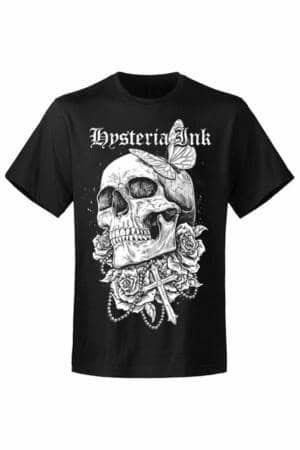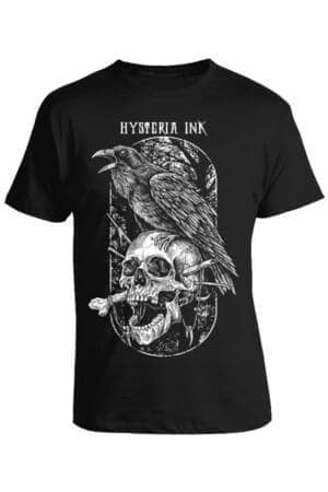 Gothic T-shirt with elaborate front print in occult ink style. Made from pure cotton, short-sleeved, with a round neckline. Unisex.