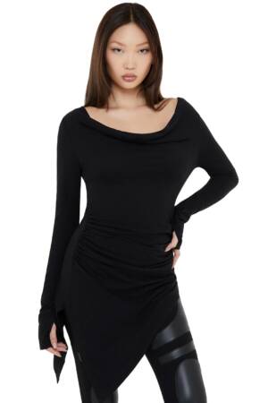 This top combines casual elegance with a dose of dark charm. The soft modal slub jersey makes it comfortable to wear, while the waterfall neckline and asymmetric hem with lace effect create a striking silhouette. Perfect for versatile layering looks - from casual to gothic-chic.