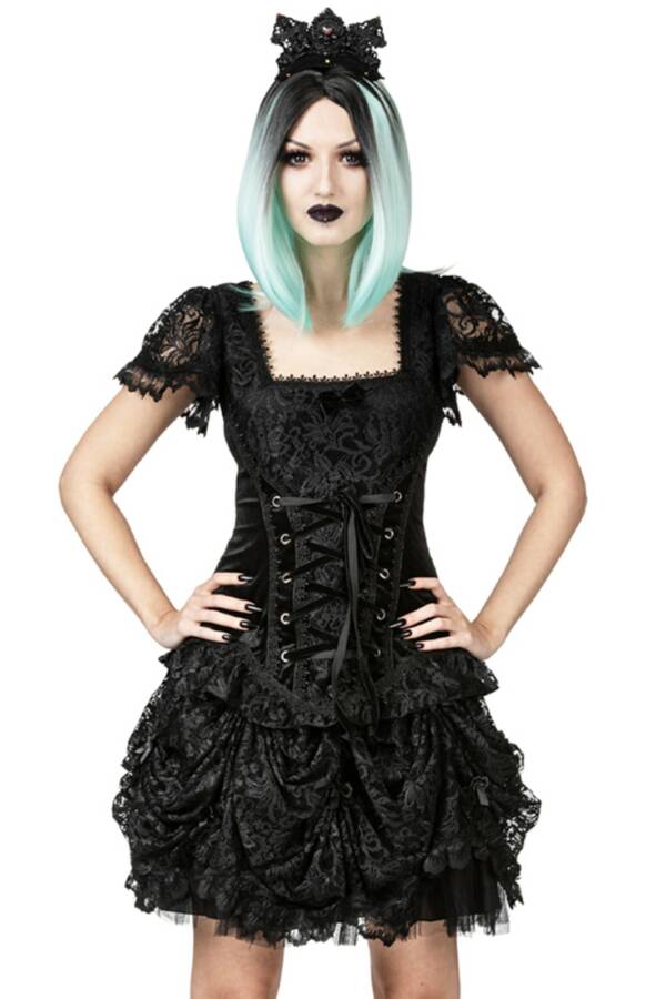 Elegant underbust bodice made of black velvet, decorated with delicate black Venetian lace trim and black satin ribbon lacing with metal eyelets. The V-shaped insert on the back is decorated with a large bow made of velvet ribbon and a soft tassel made of black pearls. Lined with silky-soft satin and has flexible plastic rods. The lacing can be worn at the front or back.
