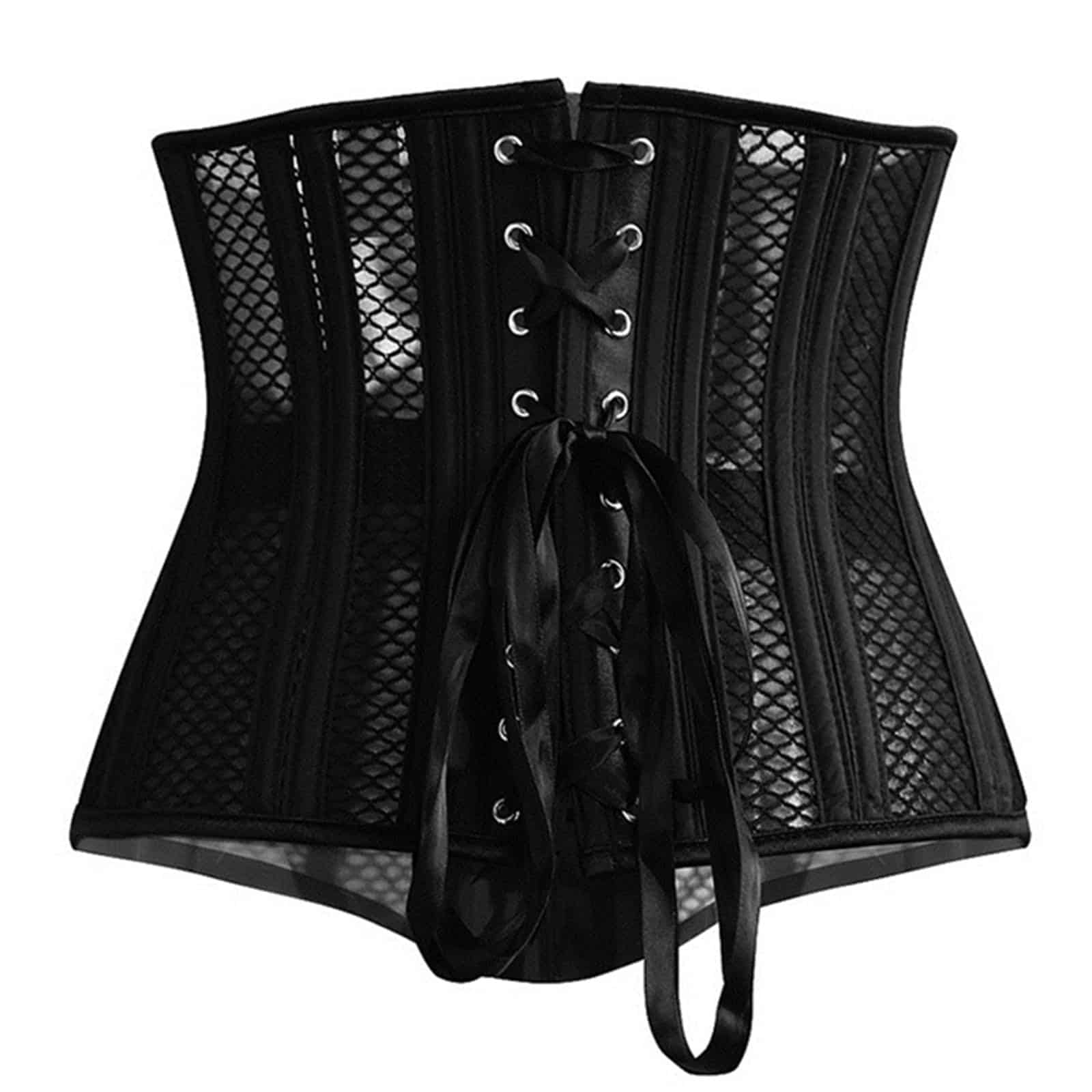 Seductive lightweight underbust corset with plastic stays, satin back lacing and hook closure. The incorporated coarse mesh mesh material is lightly lined with a fine mesh material and is transparent. Can be combined in a variety of ways.