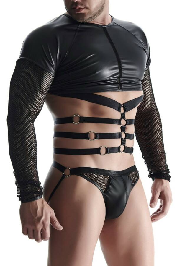 Strappy top made of fine mesh with opaque faux leather inserts. The front is decorated with lacing and a silver cross. The top is fastened at the back with hooks and eyelets. The straps are adjustable.