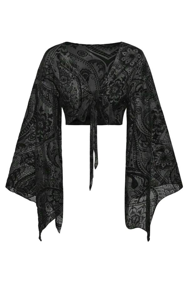Slightly transparent top with long trompe l'oeil sleeves, a deep V-neckline and front lacing. A floral pattern extends across the entire material.